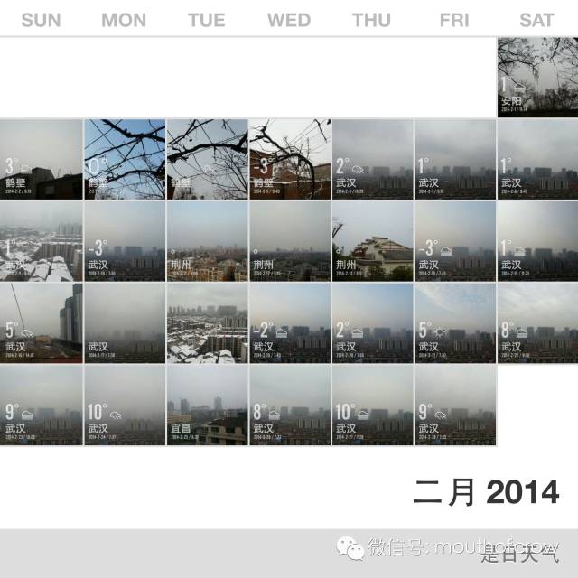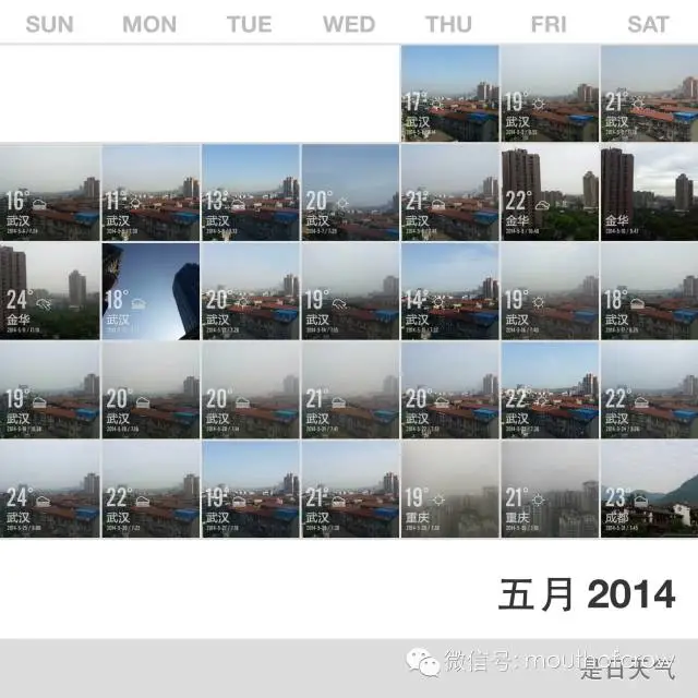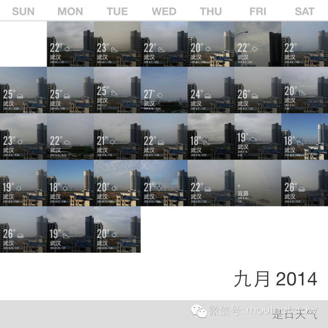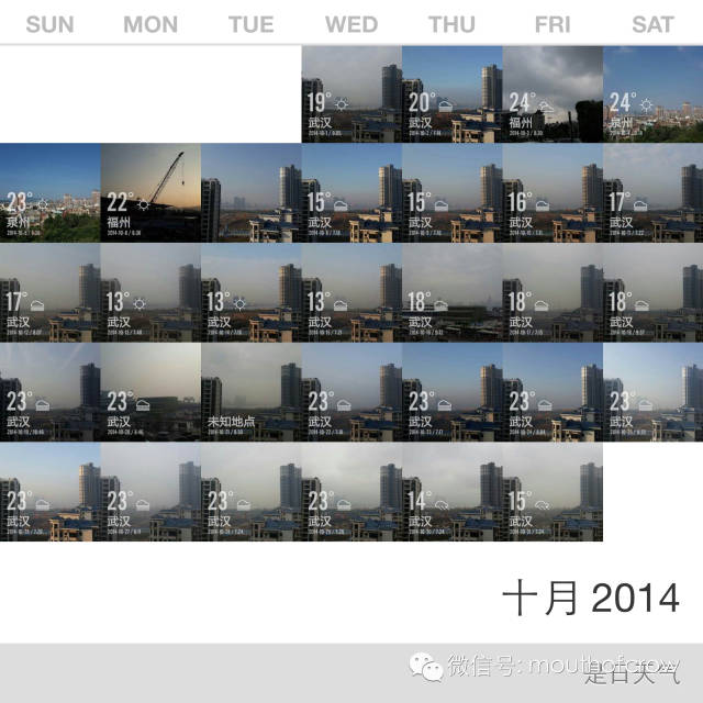 像去年不一样我没有继续用excel进行拼图,而是选择了collect这个app进行归类和记录,天气记录继续用了“啪啪”这个app。(需要说明的是,因为啪啪的bug导致11月、12月武汉天气每天都一样,这与“武汉每天不一样的口号”是不相符的,于是我就决定2015年起更换软件了,感谢啪啪近两年的支持,我给你们反馈过这个bug,但没人搭理我,另一个原因就是你们开始了强制录音,跟我的需求不太相符了。特别说明一下)。