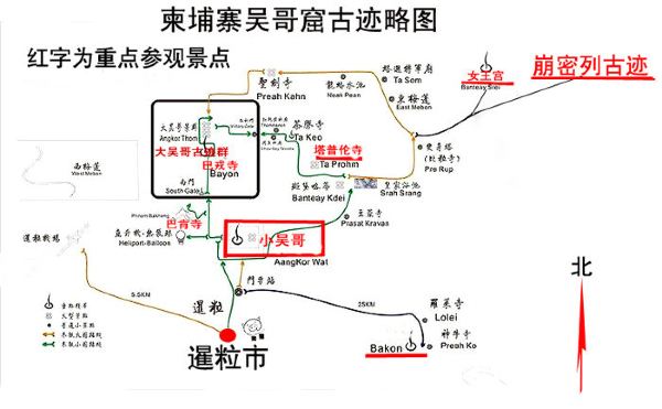 再通过这张地图来看看大吴哥城的景点分布,巴戎寺、巴方寺、空中宫殿、斗象台、癞王台、圣皮度寺,甚至前面的圣琵丽寺、泰普拉南寺都一一在列,大家参观的时候可以比照游览。