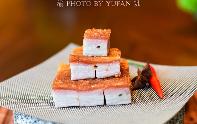 这里的菜式很讲究,分为开胃前菜、主菜、餐后甜品等,其中前菜多达六个,分别是泰椒浸南澳花螺、红油香醋白饭鱼、话梅双色圣女果、芥末冰镇黄秋葵、火焰蜜汁靓叉烧、冰烧三层肉,每一份都非常精致,上图为冰烧三层肉。