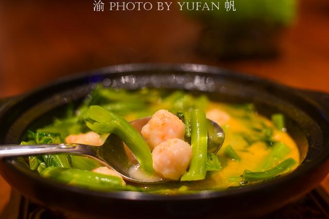 【家嫂手工虾丸浸芥菜芯】秋老虎渐近,体感温度渐凉且干燥,汤汤水水滋润的菜品逐渐得势。经千百次摔打使得虾肉更具有弹性,浸煮的方式让芥菜芯的清甜和虾丸的原味在舌尖上起舞。