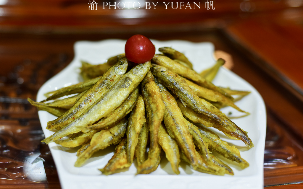 【椒盐贡鱼】此鱼由博斯腾湖而产,是全国淡水湖之最美特产,这种鱼从日本引进,对水质要求极高,属一年生小鱼,成鱼也只有这么大,但一条鱼在日本可以卖到1美元。这道贡鱼采用油炸,既脆又香,椒盐食之,特别美味,是当地著名的美味佳肴。