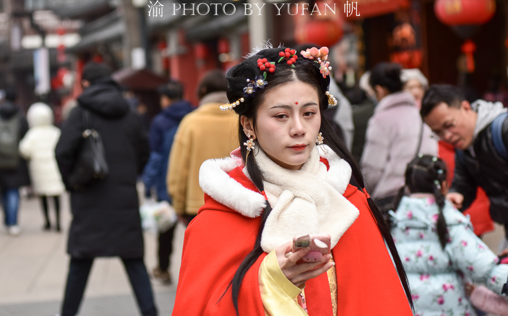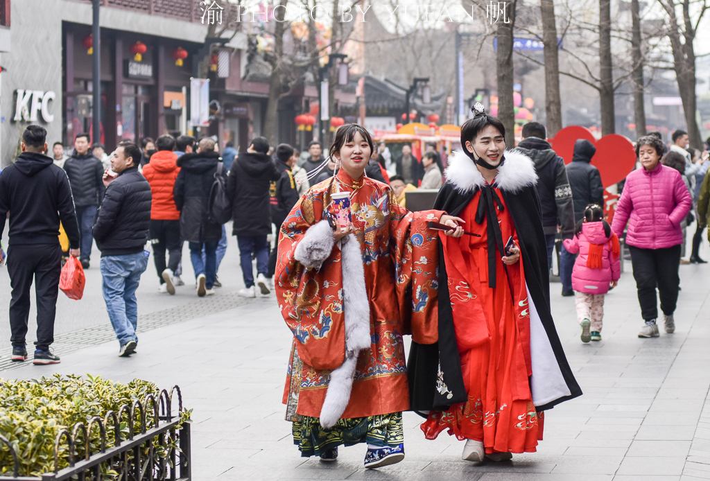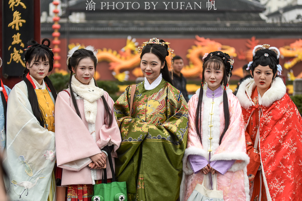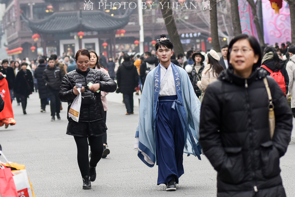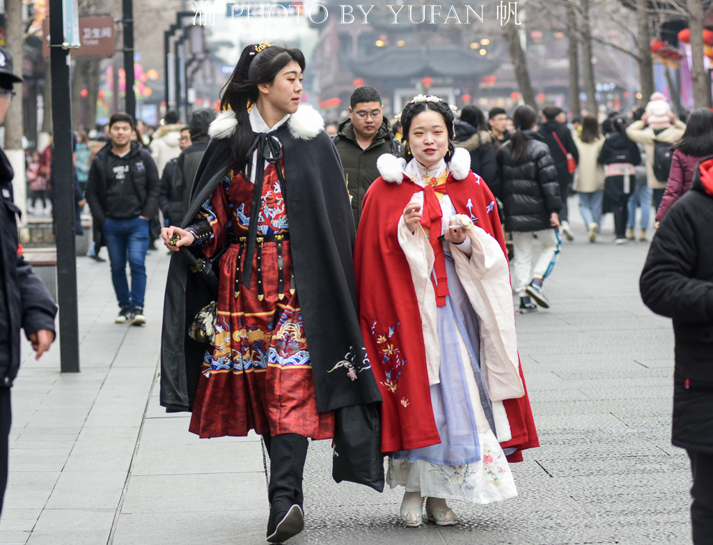 这种汉服热的现象在南京的夫子庙秦淮河风光带上尤为明显,他们觉得穿古装、游古都,才更有韵味,厚重的青砖,绵延的城墙,壮观的城楼,与华丽的汉服相得谊彰,据其中的身着宫庭装的美女介绍,她家里有五套古装,每到周末,就会脱下工装,换上汉服,约上朋友,一起去逛夫子庙秦淮河,一起寻美食,一起拍美照,一起享受这引人注目的汉服生活。在她的身边,像她这样的年轻男女还有很多,大家都把汉服当普通衣服穿,并不是为什么节日或活动而穿,而是为自己的乐趣而穿,已经成为她们生活中不可或缺的一部分,而在渝帆看来,这种汉服热也是文化自信的具体表现。