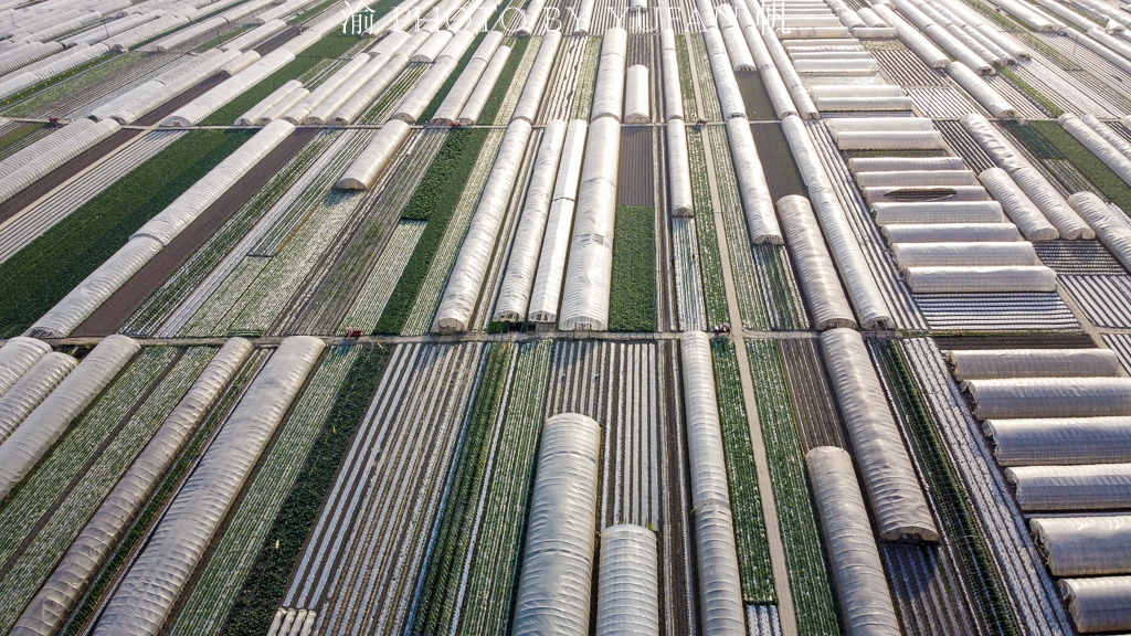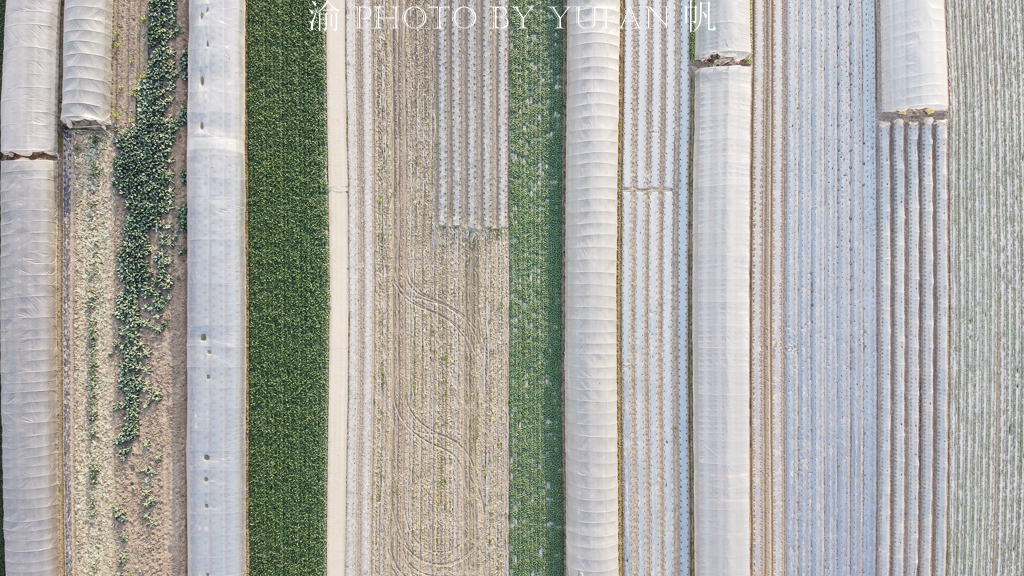 从空中俯瞰蔬菜机地,不同的蔬菜间种,有的已经采收,有的则刚刚种下,有的铺上了塑胶薄膜,色彩斑斓,如同上帝以大地为纸,绘就的一幅大美田园画卷。