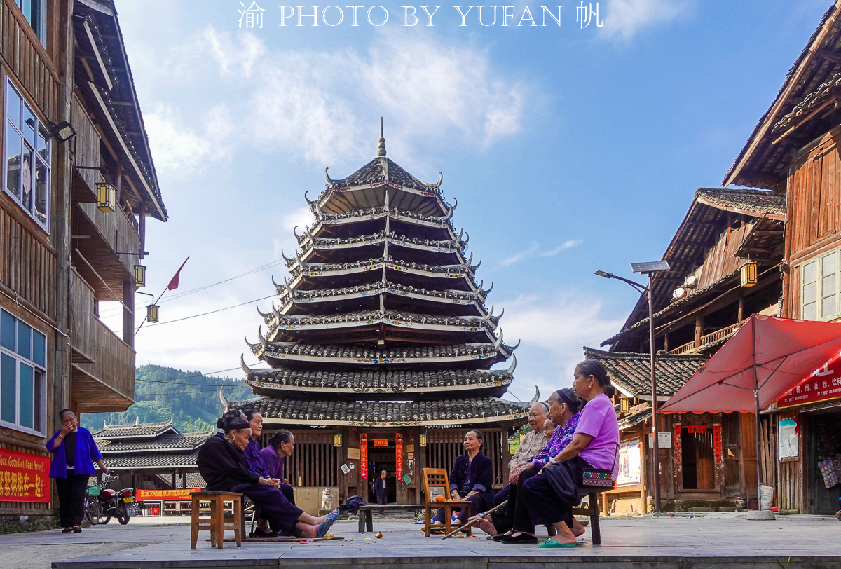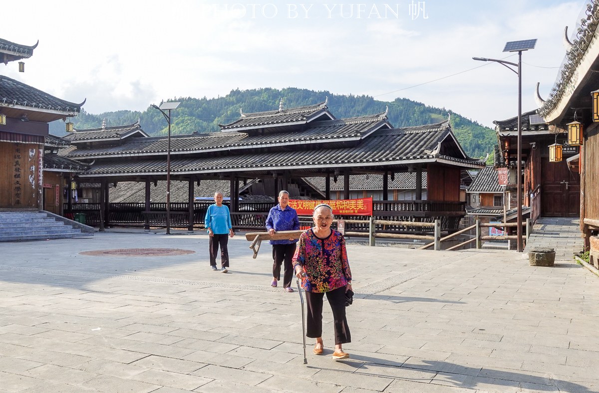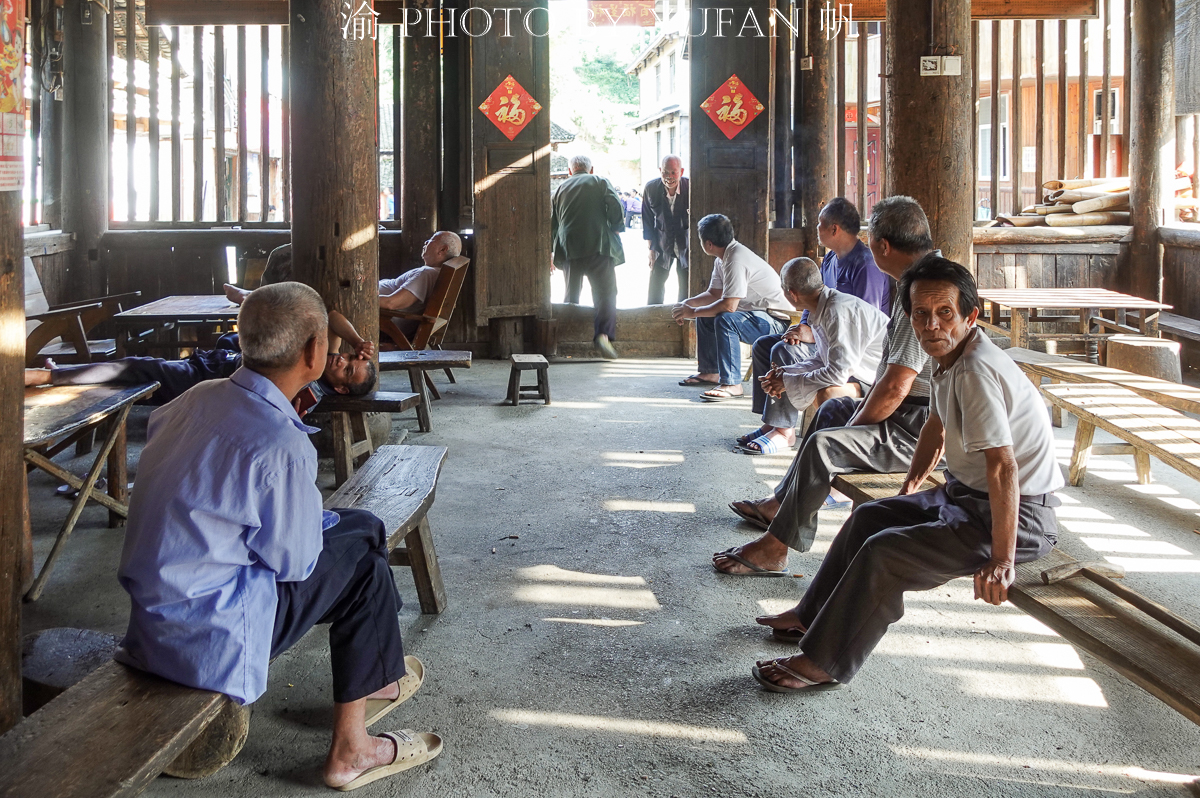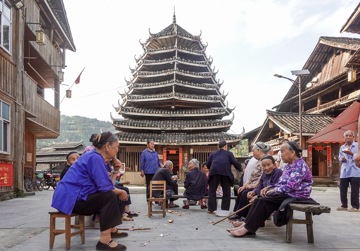 即便不是逢年过节的时候,这里也是村民最喜欢来玩的地方,当天我们到来的时候,只见鼓楼前面的小广场上,坐满了很多的老人家,他们告诉渝帆,这些人都是他们从小玩到大的好兄弟、老姐妹,大家有空的时候便会端上自家的凳子到广场上来聊天、娱乐,这已经成了他们的固家娱乐节目,要是哪一天不到广场上来坐坐,心里总觉得少了什么。