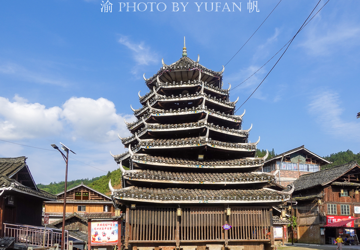 与其它的侗寨一样,有侗寨就有鼓楼,冠洞的鼓楼也是寨子里的标志性建筑和最高建筑,它始建于清朝的康熙年间,是一座九层的全木质宝塔型建筑,中心由四根大杉木柱组成核心架,直达楼顶。