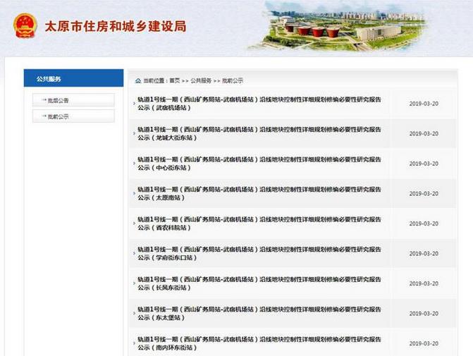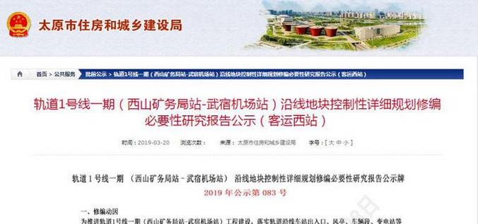 昨日(3月20日),太原市住房和城乡建设局官网公示《太原轨道1号线一期(西山矿务局-武宿机场站)沿线控制详细规划修编必要性研究报告公示牌》。