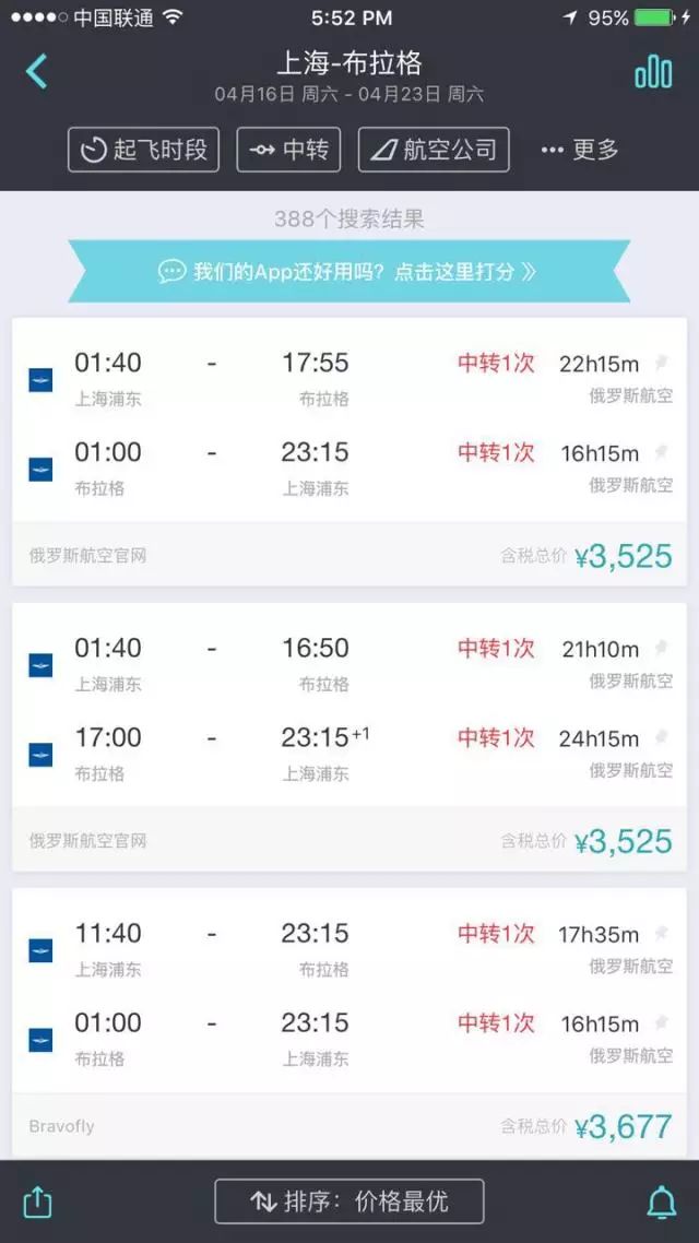 P了个S,国际机票通常是往返机票一起买,比分开买便宜很多哦。再P了个S,国际机票并不一定是越早买越便宜,除了出票量极大的欧美日韩新马泰之类的目的地,其他地方的机票通常都会稳定在一个相对合理的空间,并不会大幅波动——比如,我今天搜到的3月26-4月3日的印度德里往返机票,以及4月16日-4月23日的布拉格往返机票(如下图所示),含税总价目前都只要3K多,相对于提前半年甚至一年购买的所谓特价票,风险系数更低(毕竟你无法提前半年预知到时候去不去得了,占了“便宜”却有可能损失更大哦)。