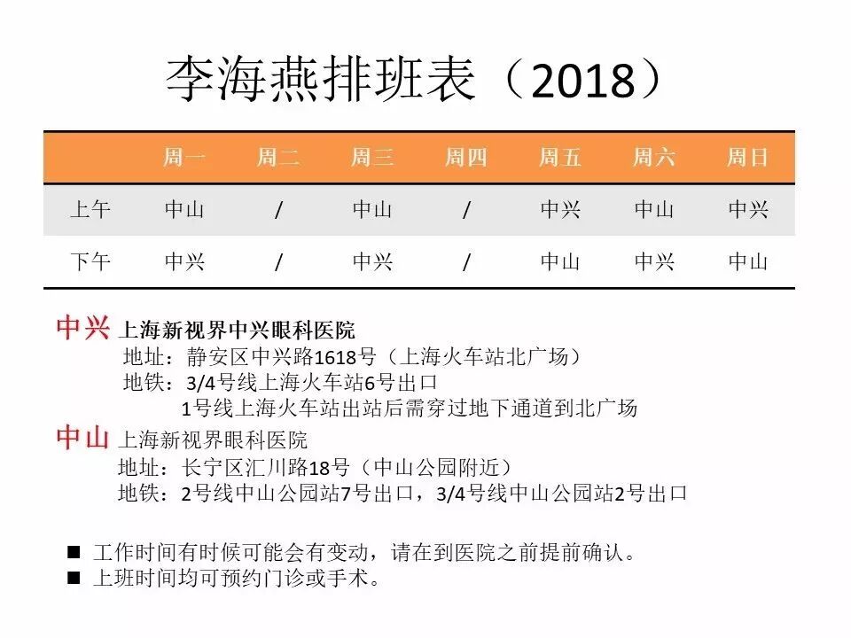 (A)中兴路1618号,在上海站附近,切记是上海站,不是其他火车站,外地朋友订票时可尽量选择“上海”站,不是“上海南”或者“上海虹桥”。火车站从北广场出站(注意:是北广场,不是南广场),就可以看见医院,步行两分钟就到了。如果从上海其他地方乘坐地铁,请选择3号线或者4号线,到“上海站”站下车,6号口出来,步行到达医院只需要3分钟。自己开车请导航选择“中兴路1618号”。我在中兴路院区的门诊时间:周一下午,周三下午,周五上午,周六下午,周日上午。