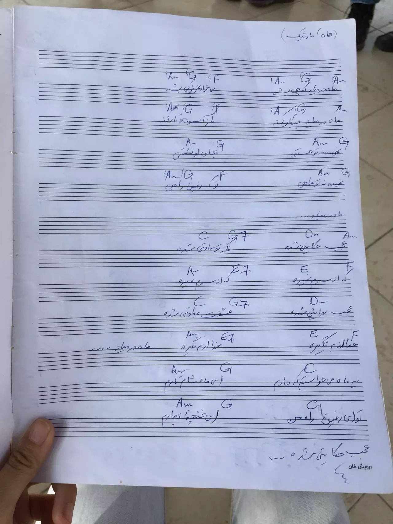周末在德黑兰的公园里,偶遇几位弹吉他的年轻男女。尽管语言不通,政治不同,经济各异,习俗有别,但是艺术是无国界的,毕竟我也是架子鼓手。等走近聊起来才发现,人家的乐谱,也和我认识的大相径庭。一张类似五线谱的乐谱上,我唯一认识的标识就是和弦,其他一如波斯语一样,都是「鬼画符」。