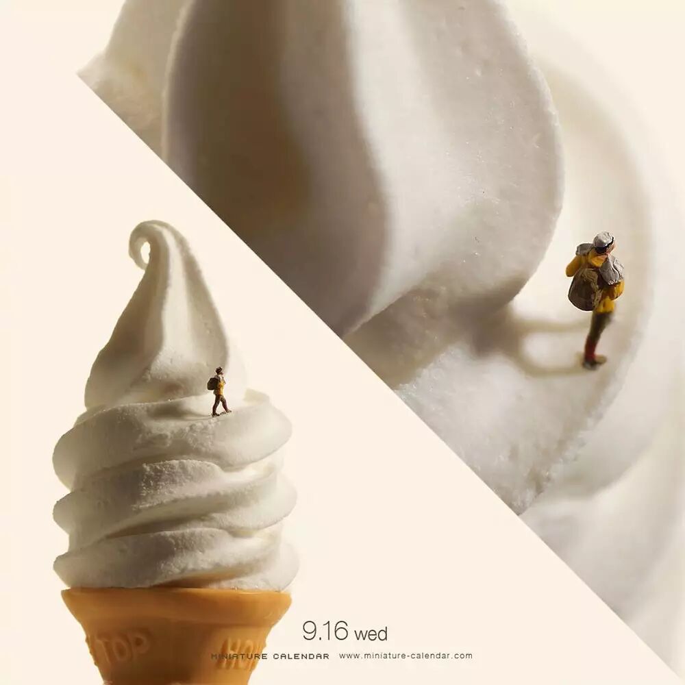 他的微型世界中,食物出镜率最高。不同形态、纹理、质感的食材,淋漓尽致展现吃货眼中的世界:拍在沙滩上的层层叠叠的海浪,在他看来与一片雪花牛肉差不多;蛋筒冰激凌冒着尖尖儿,是一座供人攀爬的雪山;大雨倾盆直下,他用挂面表现出雨水的淅淅沥沥。