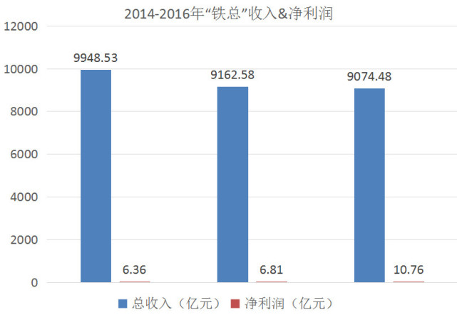 2016年,”铁总“收入9074.48亿,净利润仅有10.76亿元。往年情况也不大好,2015年净利润为6.81亿元,2014年为6.36亿元,相对收入而言,赚钱真的不多。