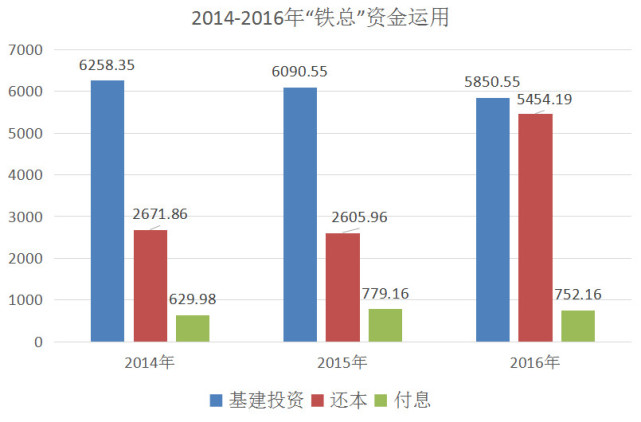 根据”铁总“披露的信息,2016年基建投资5850.55亿元,偿还借款本金5454.19亿元,支付利息752.16亿元。