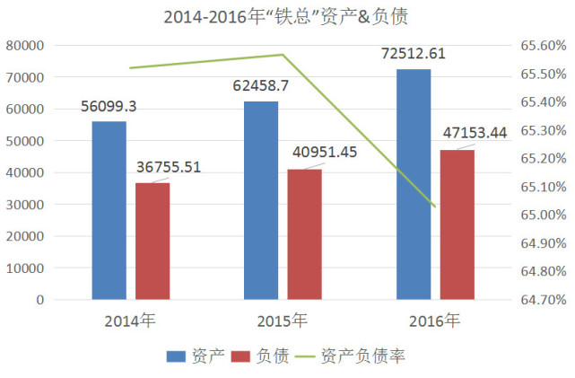 2016年,“铁总”资产总额为72512.61亿,负债总额为47153.44亿,资产负债率为65.03%。