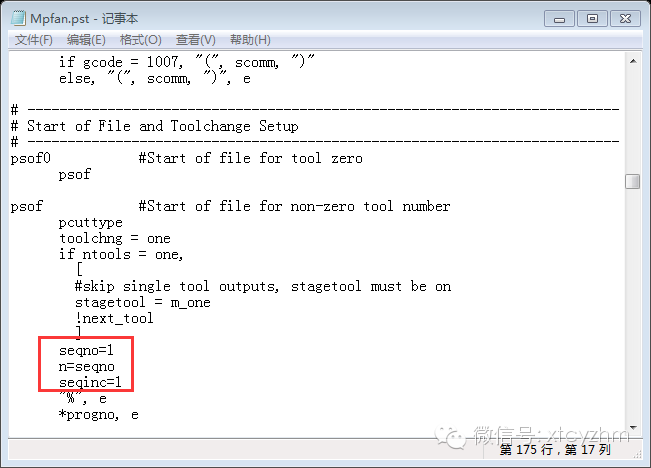 另外一种一劳永逸方法就是修改后处理,这里需要添加几行代码,定义变量,如下图中我红色框里面的代码,添加在图中的位置。这里请保持行号开关是打开的,也是是输出行号,上面已经讲到了怎么样打开/关闭行号输出。