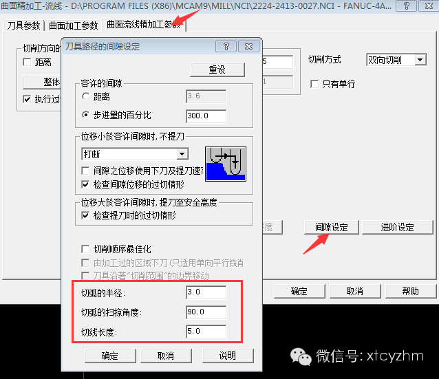 这里有三个参数可以设置,可以设置出来的刀路圆弧半径,切弧的扫掠角度是所走圆弧刀路的长度,切线长度是延伸刀路直线部分。