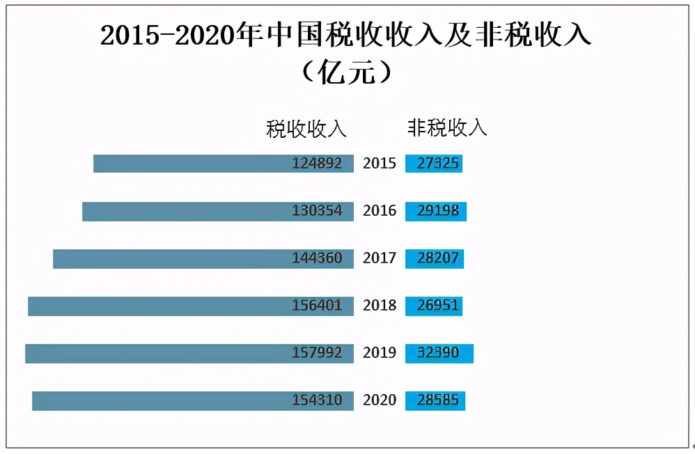 2020年全国税收收入首次出现下降,收入为154310亿元,较2019年的157992亿元同比下降2.33%;2020年全国非税收入为28585亿元,较2019年的32390亿元同比下降11.75%。