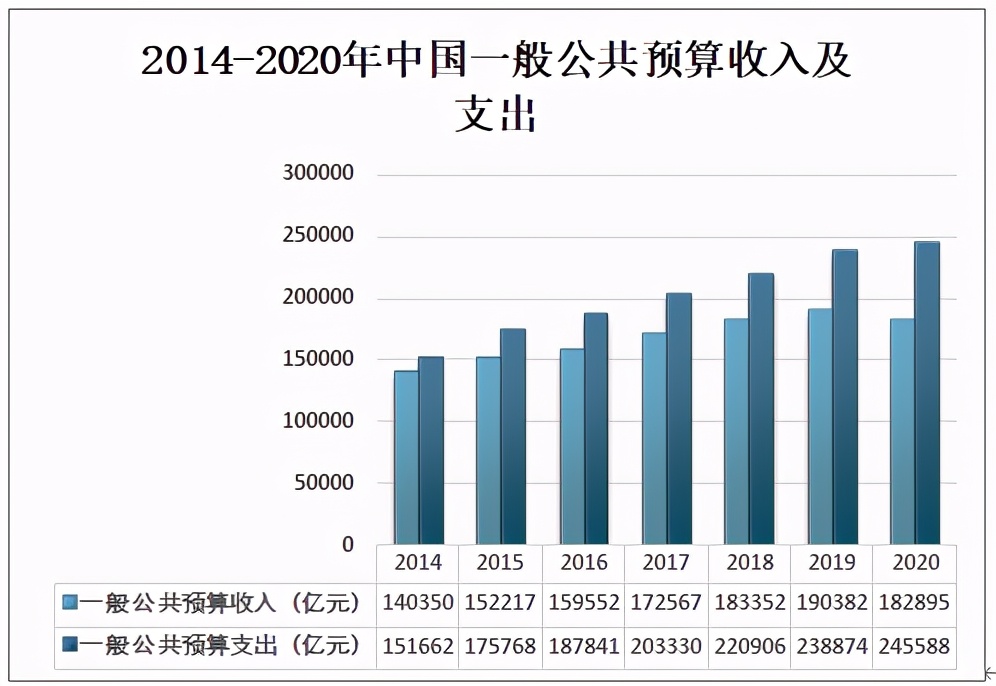 一般预算收入是财政收入的来源之一,有计划有组织并由国家支配的纳入预算管理的资金。随着经济持续稳定恢复,财政收入逐季回升。根据财政部数据显示:2020年中国一般公共预算收入为182895亿元,较2019年减少了7487亿元;一般公共预算支出为245588亿元,较2019年增加了6714亿元。