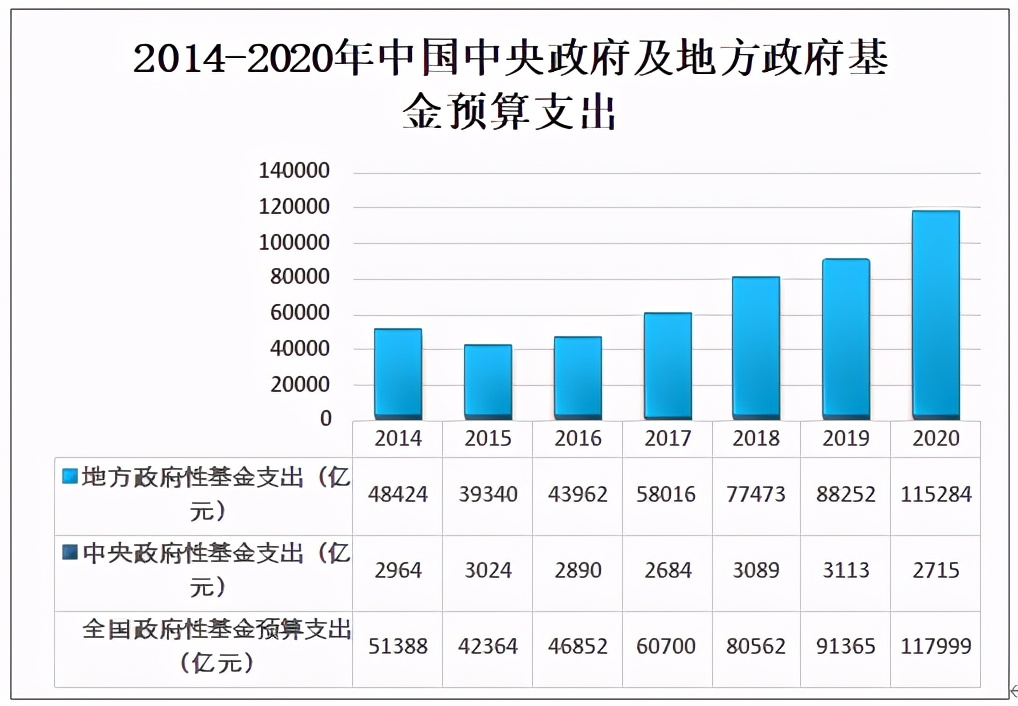 2020年中国政府性基金预算总支出为117999亿元,其中中央政府性基金预算支出为2715亿元,占总支出的2.30%;地方政府基金预算支出为115284亿元,占总支出的97.70%。