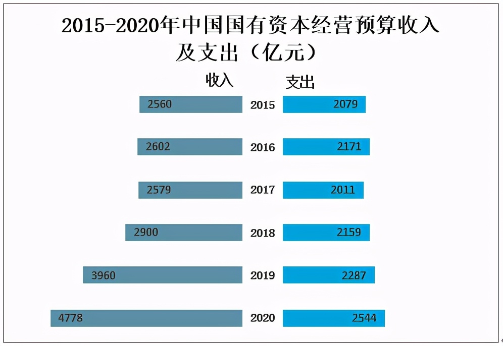 中国国有资本经营预算收入及支出整体不断增加,2020年中国国有资本经营预算收入为4778亿元,支出为2544亿元。