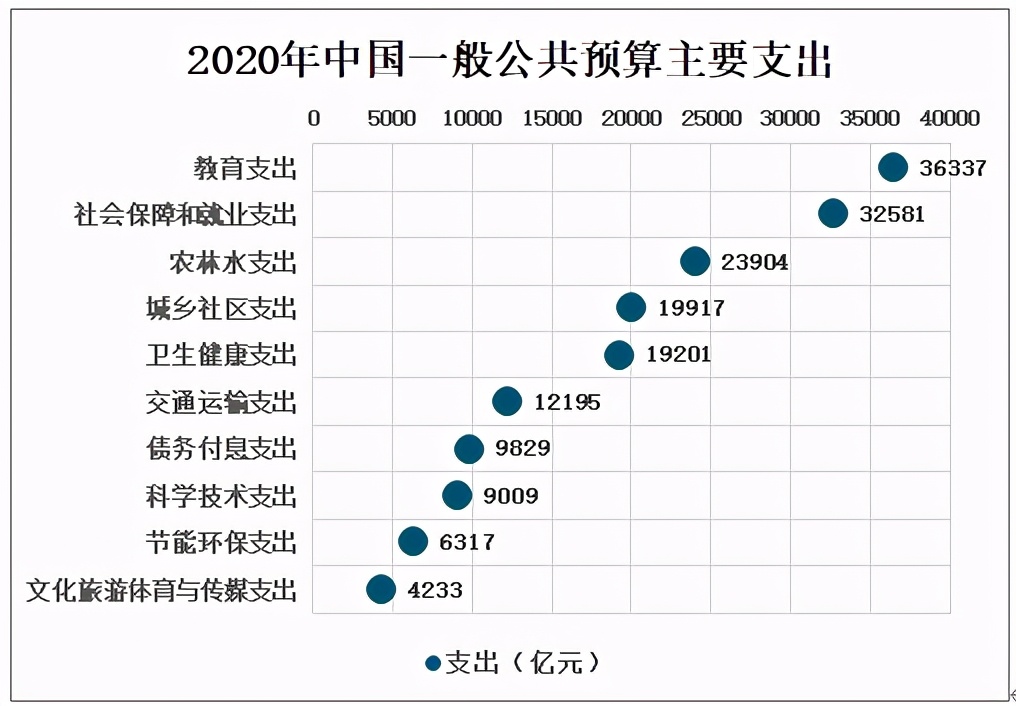 一般公共预算支出主要有教育支出、社会保障和就业支出、农林水支出,城乡社区支出及卫生健康支出;2020年中国教育支出为36337亿元、社会保障和就业支出为32581亿元,农林水支出为23904亿元。