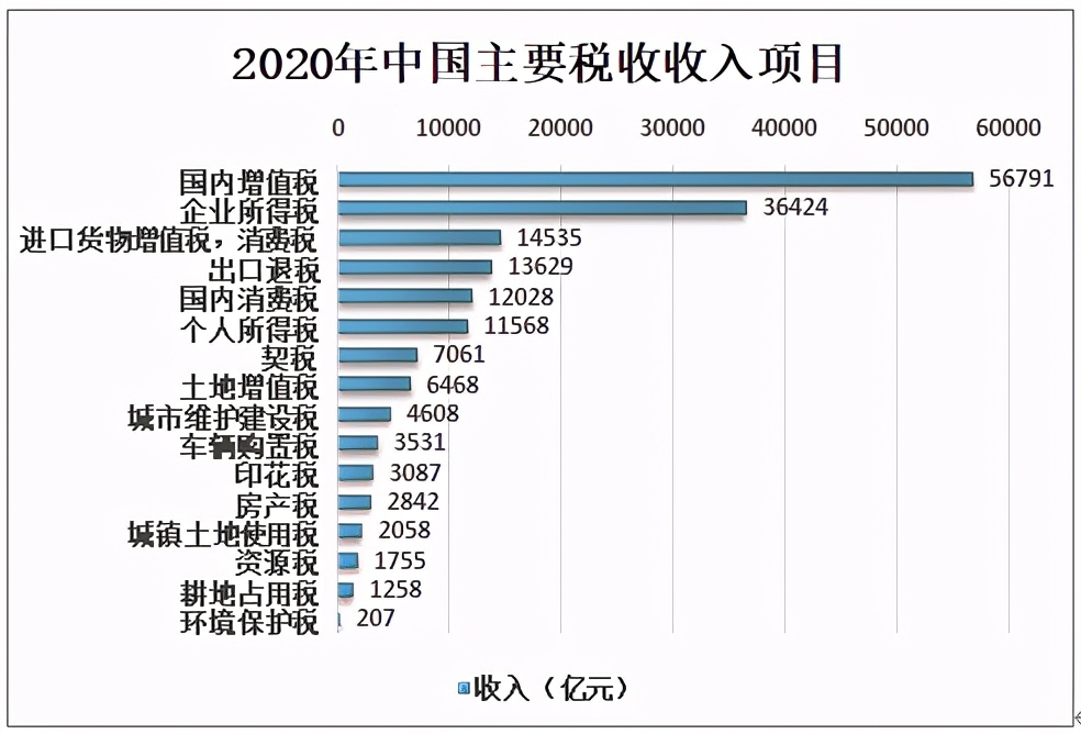 中国主要税收收入项目有增值税、企业所得税、进口货物增值税,消费税等;2020年中国国内增值税收入为56791亿元,企业所得税收入为36424亿元,进口货物增值税,消费税收入为14535亿元。