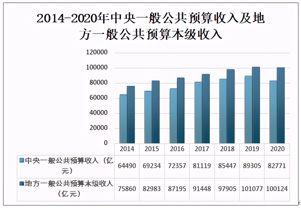 2020年中国中央一般公共预算收入为82771亿元,占总收入的45.26%;地方一般公共预算本级收入为100124亿元,占总收入的54.74%。