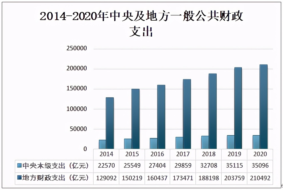 一般预算支出是国家对集中的预算收入有计划地分配和使用而安排的支出。2019年中国中央本级支出为35115亿元,地方财政支出为203759亿元;2020年中国中央本级支出为35096亿元,地方财政支出为210492亿元。