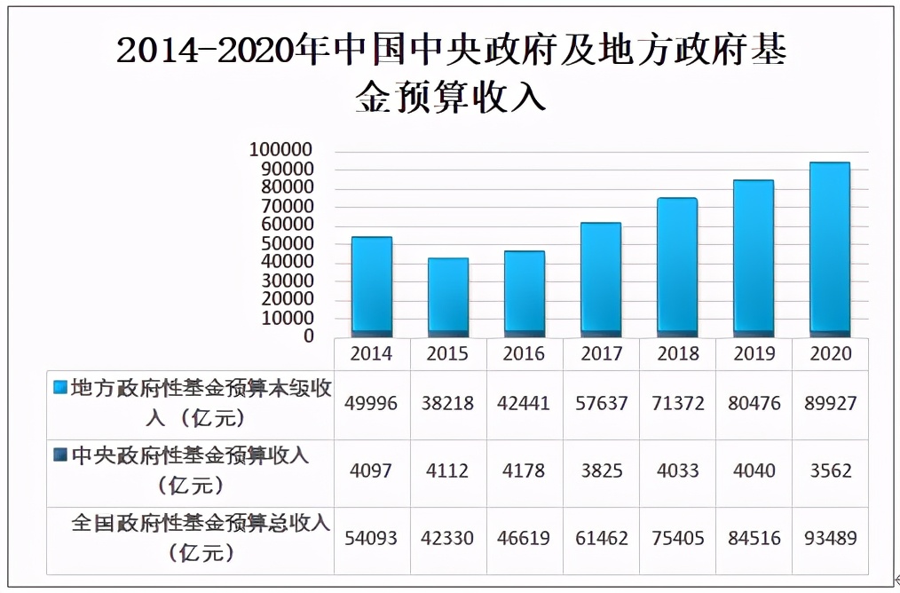 政府性基金是对依照法律、行政法规的规定在一定期限内向特定对象征收、收取或者以其他方式筹集的资金,专项用于特定公共事业的发展。2020年中国政府性基金预算总收入为93489亿元,其中中央政府性基金预算收入为3562亿元,占总收入的3.81%;地方政府基金预算收入为89927亿元,占总收入的96.19%。