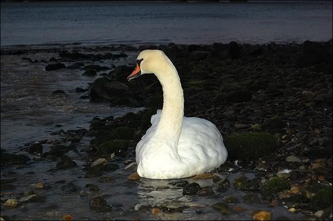 又拍了几张再抬头,她还在那里看着。实在不好意思让她久等,于是俺起身迅速回到了河堤上。再次向她表示感谢后,俺问:“这只goose是一直在这里么?”这位大婶级女士回答道:“不,不,这是一只swan。”对此俺真是有些意外,她接着说:“这里有两只天鹅,另一只应该就在不远处。”