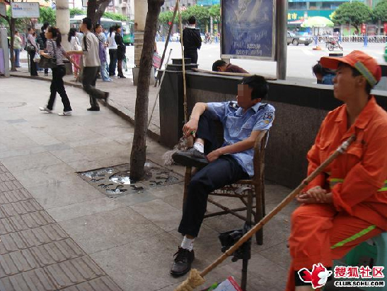 从后一张图片,读者可以从两个人的形态,看出两种职业的差异。保洁工是社会中最没有地位的,缺少寻租能力的工作,因此,他们往往有一种自卑感,这种自卑感最终是以自尊的形式表现出来的,试想,一个最“卑贱”(虽然好听的说法是只有分工不同而没有贵贱之别)的工作者,如果自己再瞧不起自己,就真的没有人会高看你了。所以他们反而较比他人更讲究对社会规则的遵守,讲究自己的的社会形象,关注社会评价。而“城管”的工作性质是权力面前是孙子,贱民面前是爷爷,一个工作被赋予这样一种社会观念,并被某些城管队员内化成自己的行为意识的时候,其内心中道德价值和现实之间的平衡就被打破了,内心的失衡导致他们将执法与违法集中于一身。所以他们其实很迷茫,时而觉得自己很强有力、很伟大;时而有觉得自己很龌龊、很低微。大爷的模样不过是这外强中干的表现而已。
