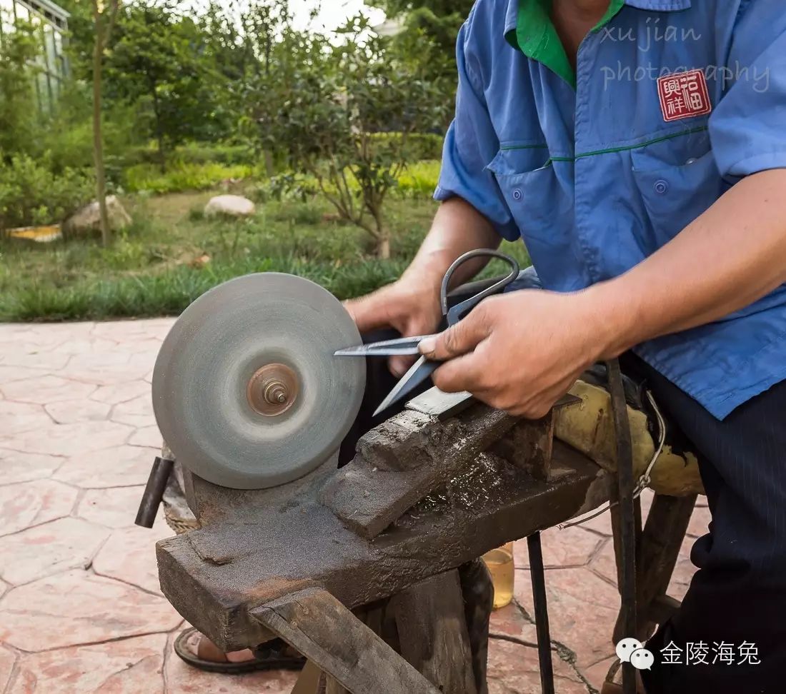右手摇起砂轮,左手拿着剪刀,先用砂轮粗粗地打磨着。