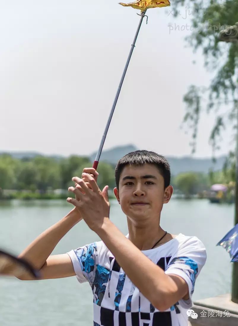 三伏天,在摩肩接踵的旅游人群中,这小伙子算是有点儿鹤立鸡群。