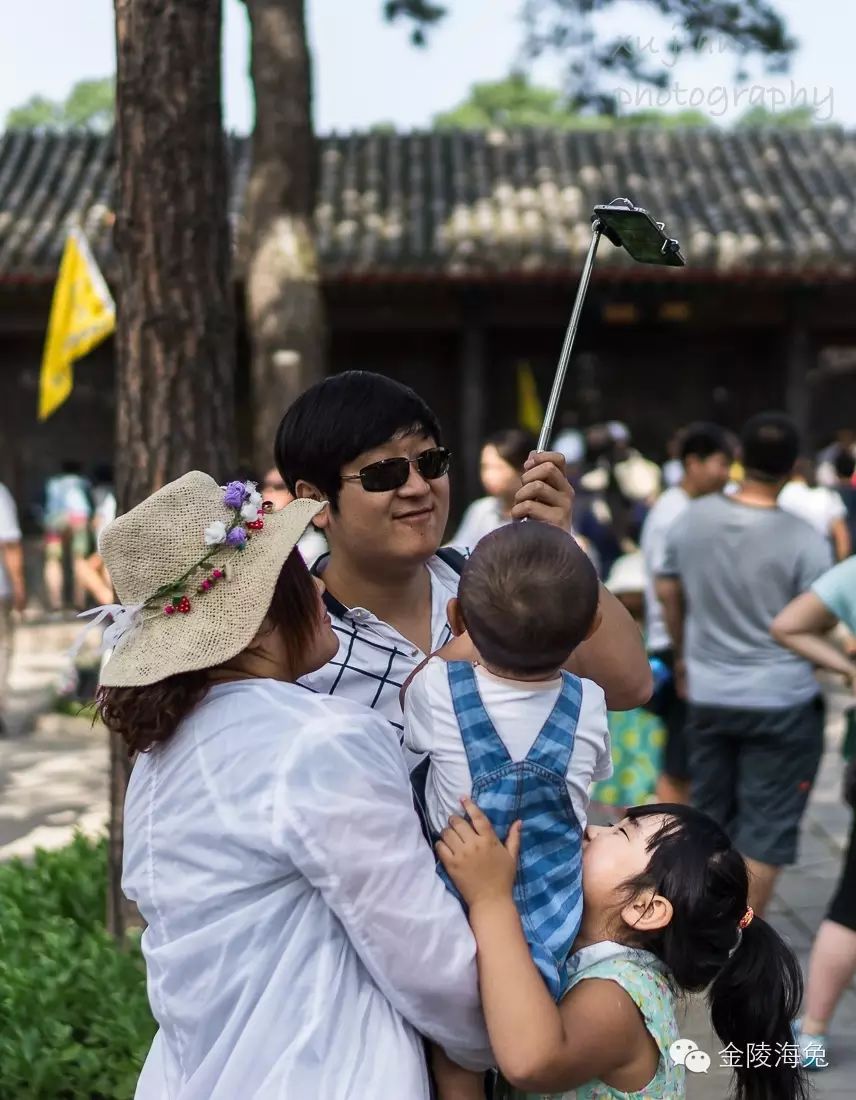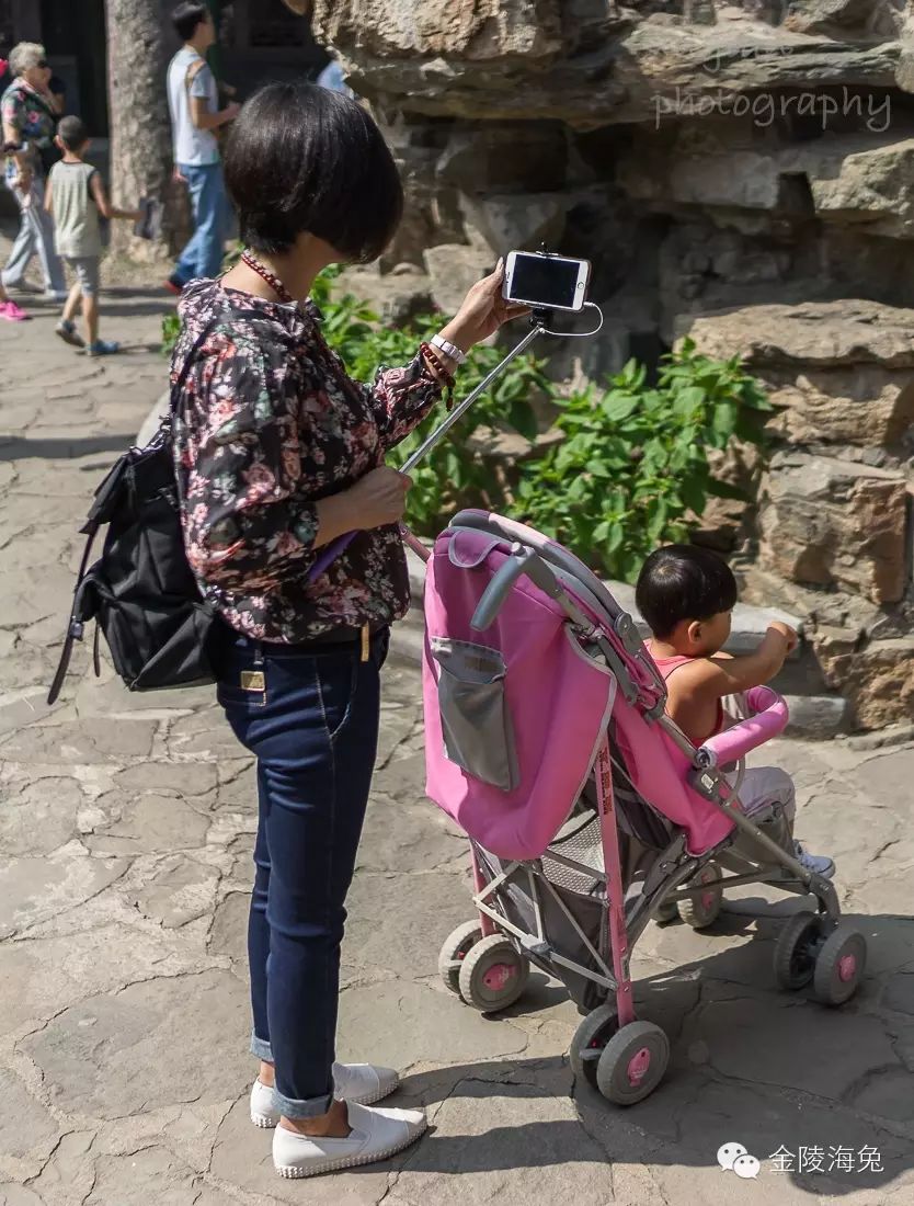 年轻的妈妈带着孩子也不忘玩自拍杆。