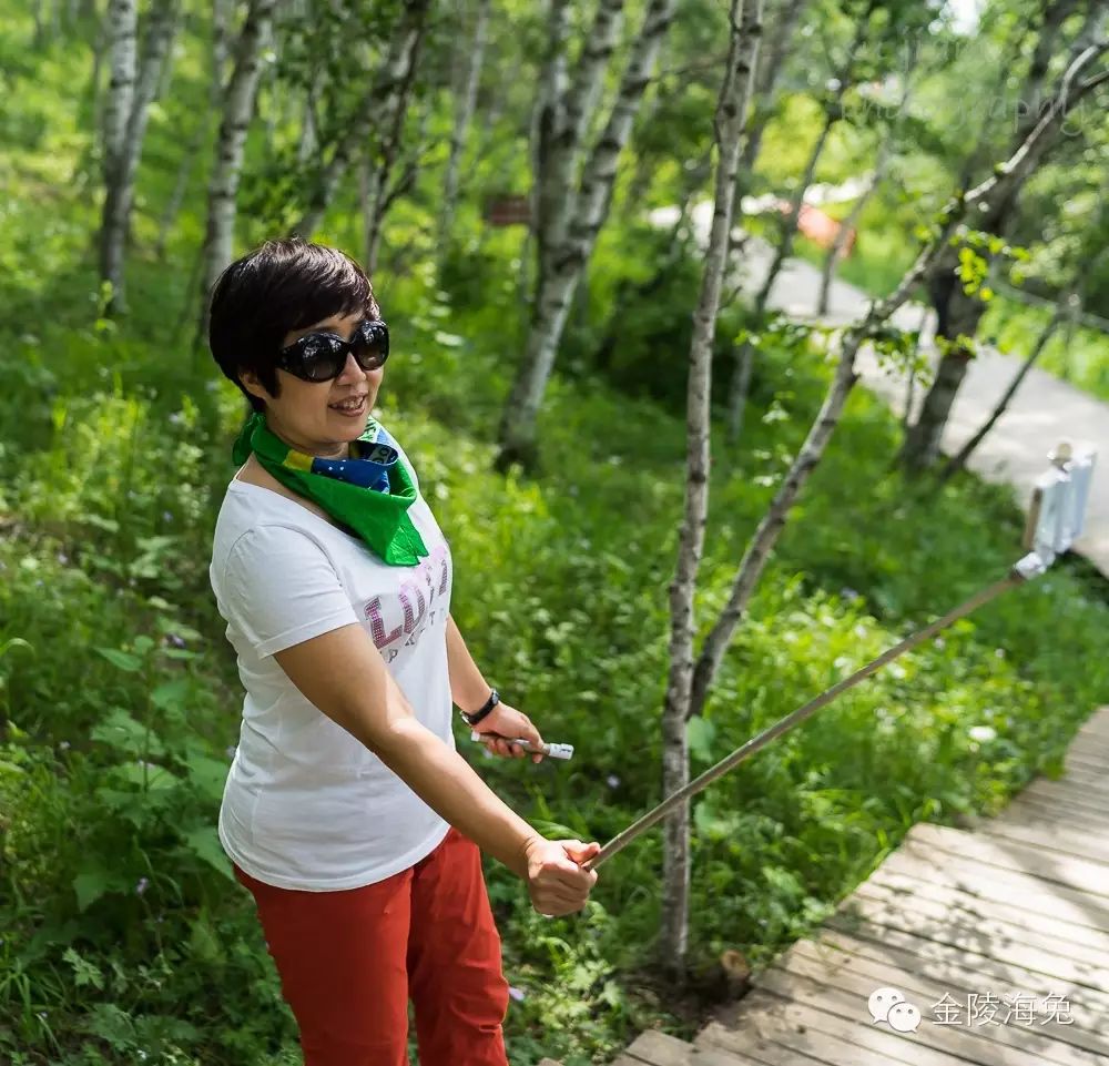 盛夏,逆光的桦树林里,游客欣赏美景的时候也没有忘记自拍一张。
