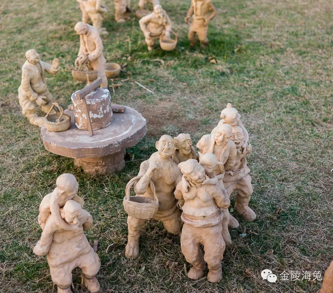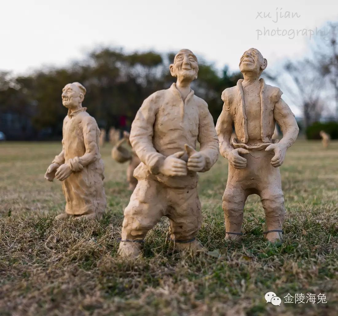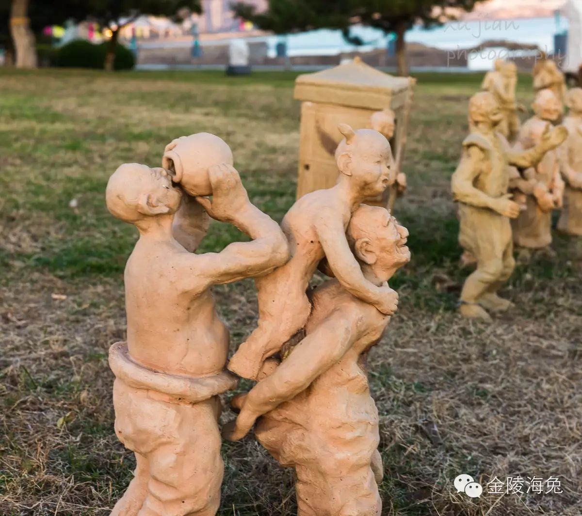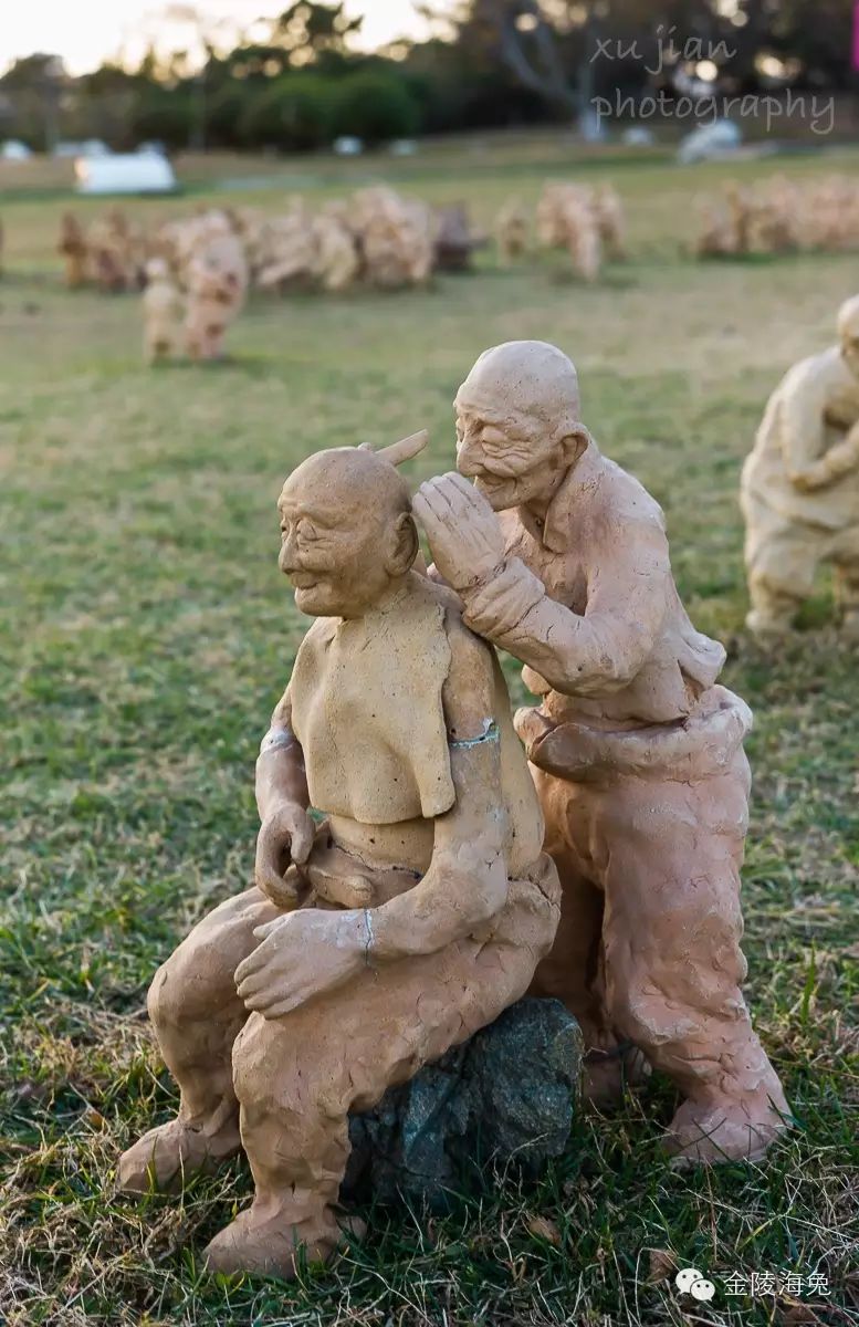 当年,在海边这一排雕塑的北草坪上,还有一大片微型泥塑。我也记下了他们的栩栩如生和千姿百态----因为我当时意识到,露天泥塑的生命是有限的,尽管北方干旱少雨。