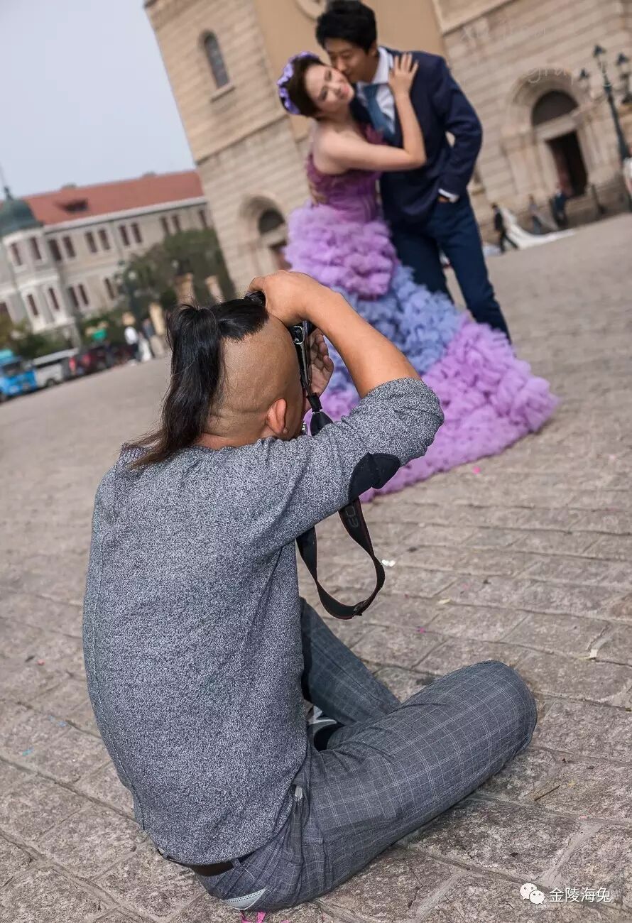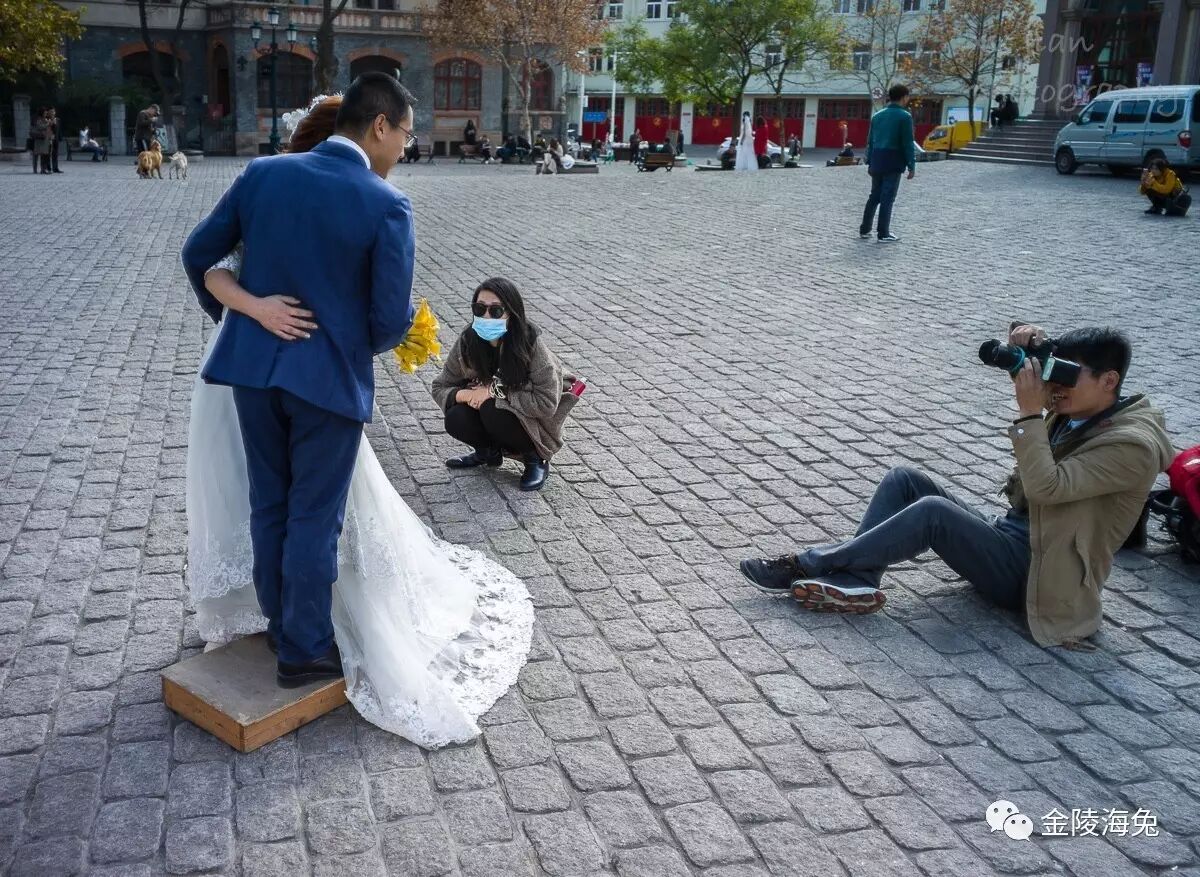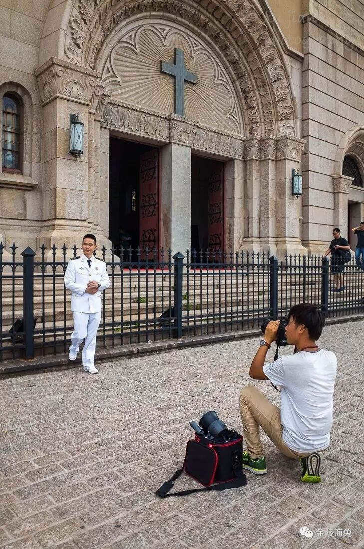 婚纱人群中很少见到军人。摄影师的跪姿倒是符合军人的要求。