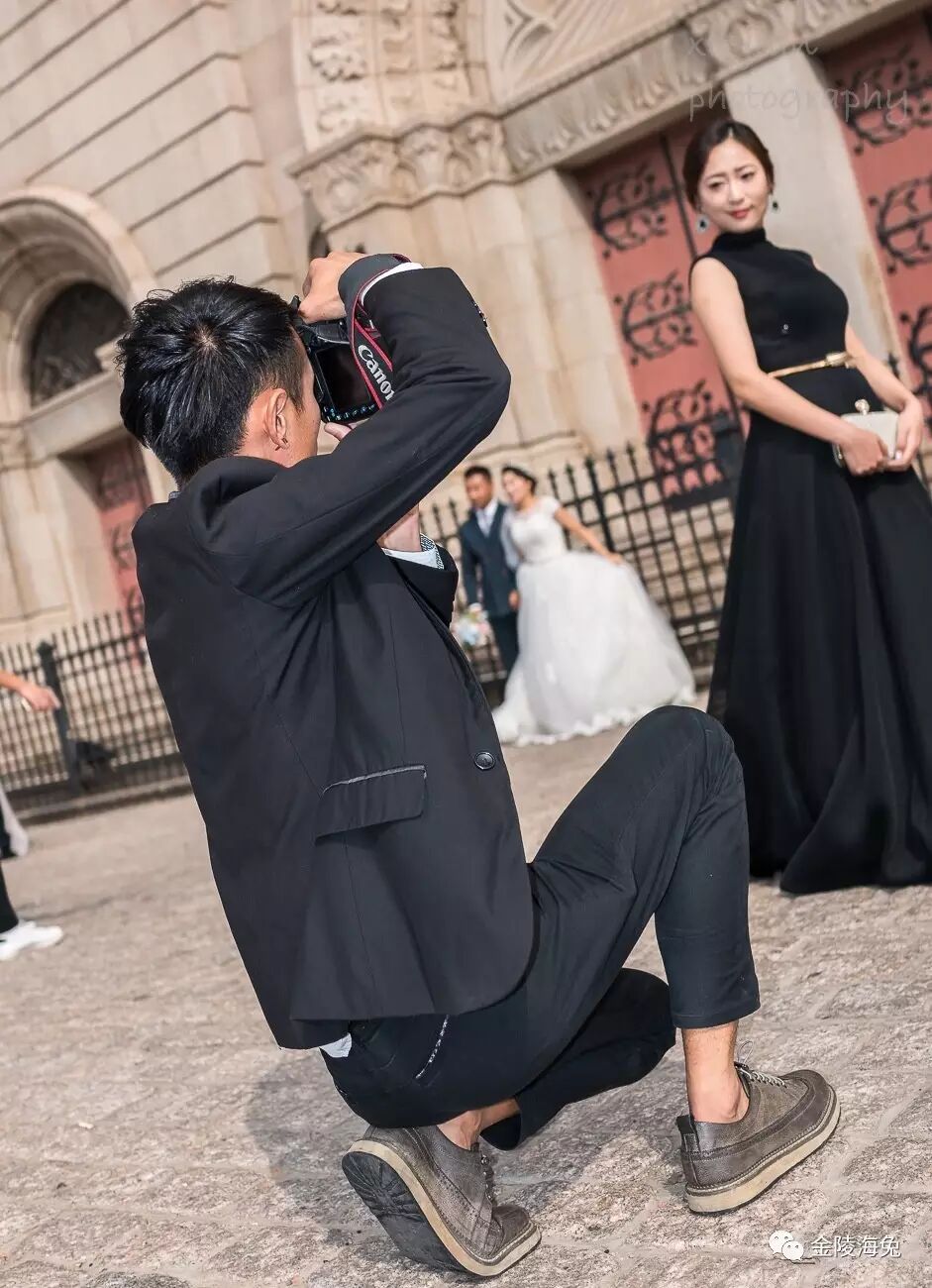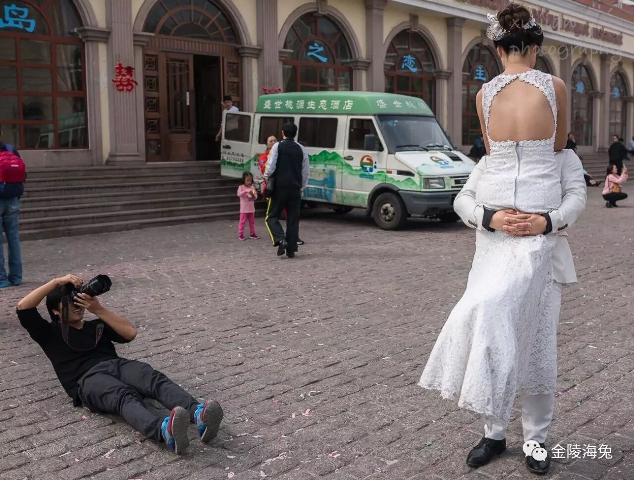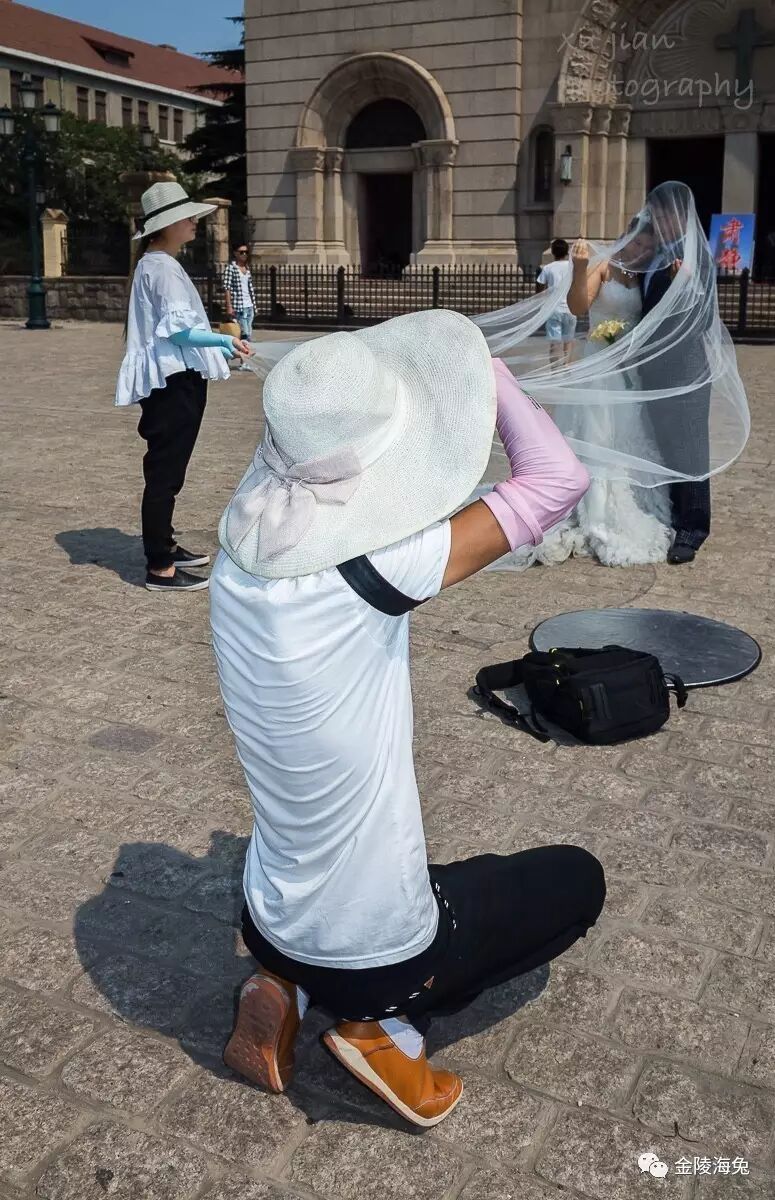 婚纱人群中很少见到军人。摄影师的跪姿倒是符合军人的要求。