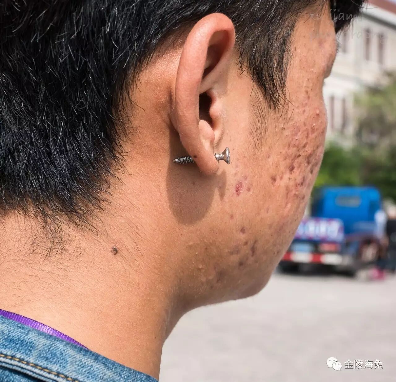 原来一颗螺丝钉穿在耳垂里----等待新打的耳洞“长好”后再拔出来,然后挂上耳饰品......时尚与廉价在碰撞!小伙子----你这“美”的也真是吃苦头啦。