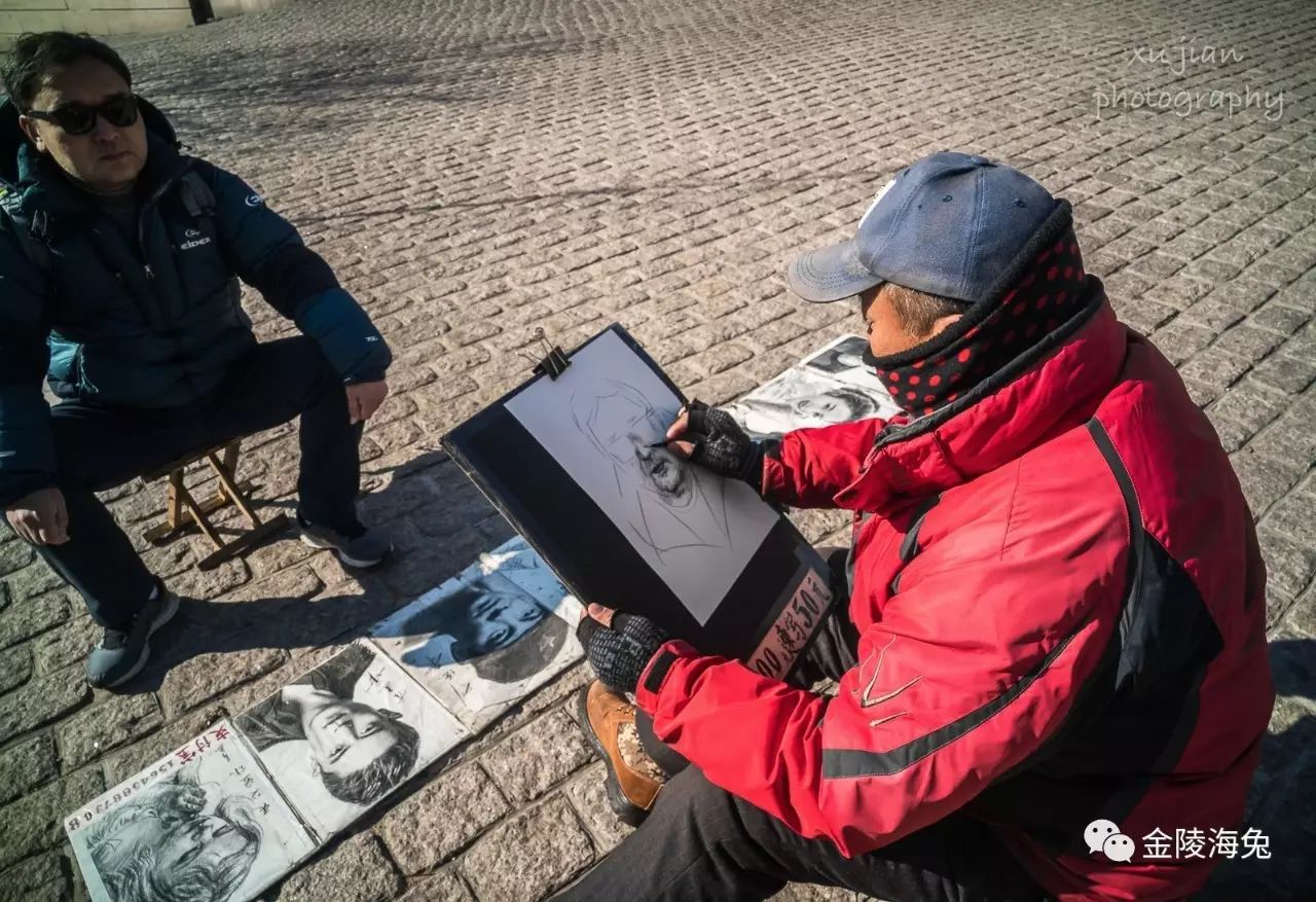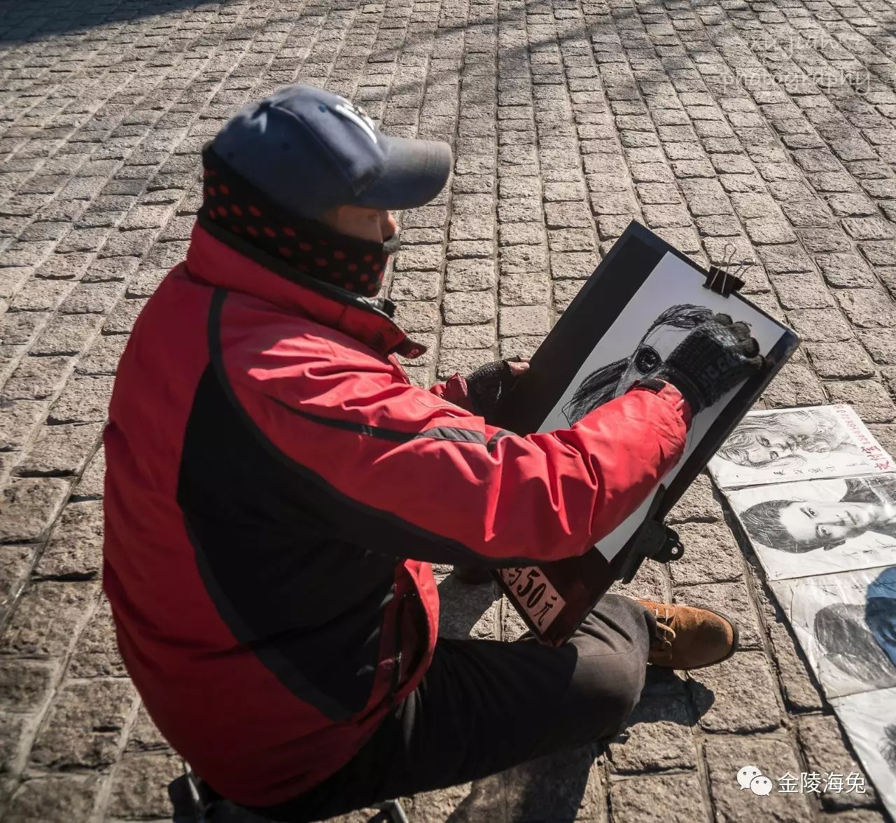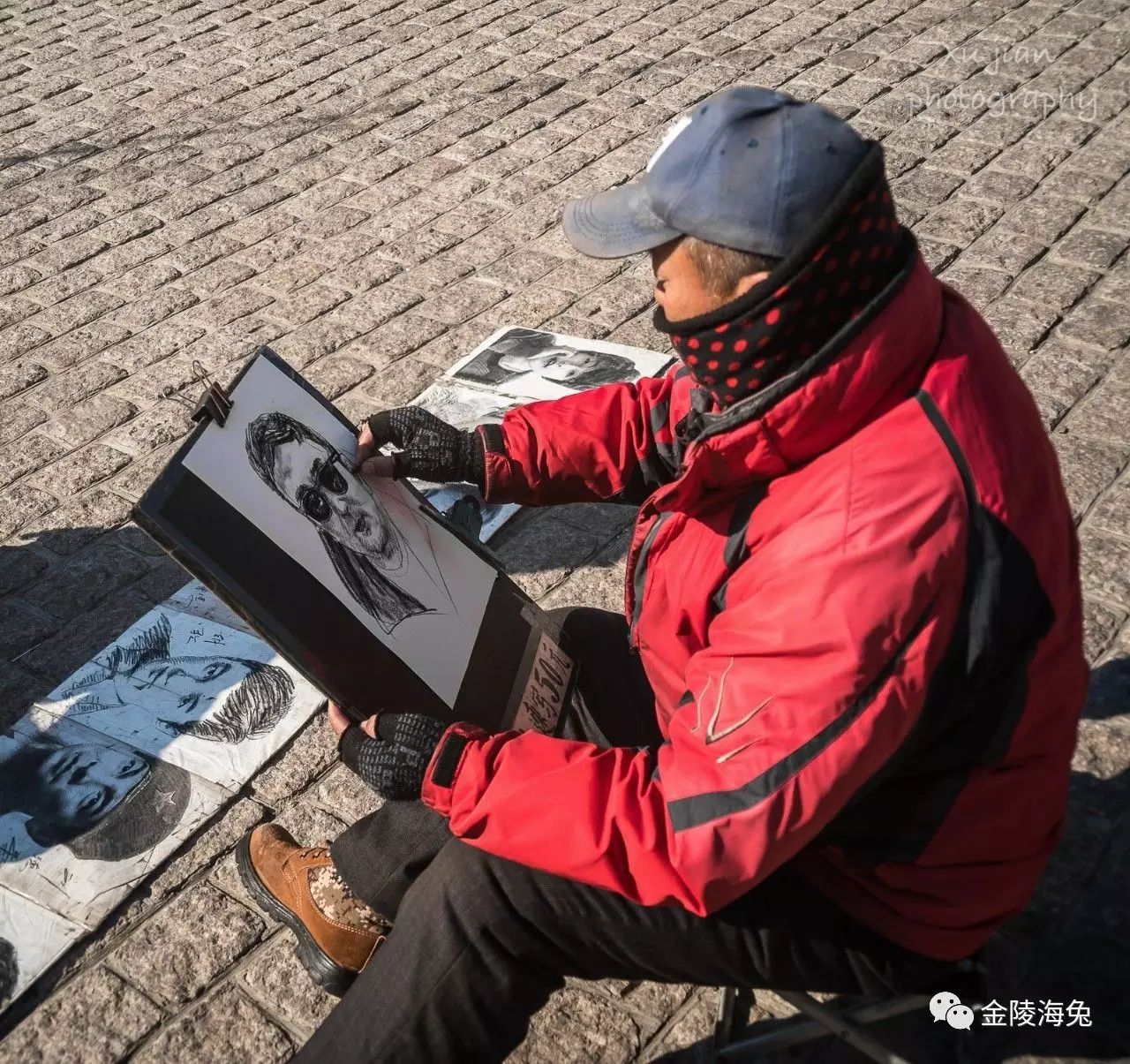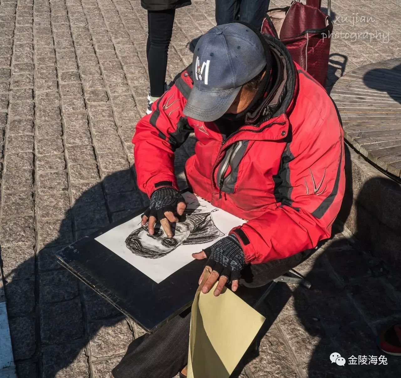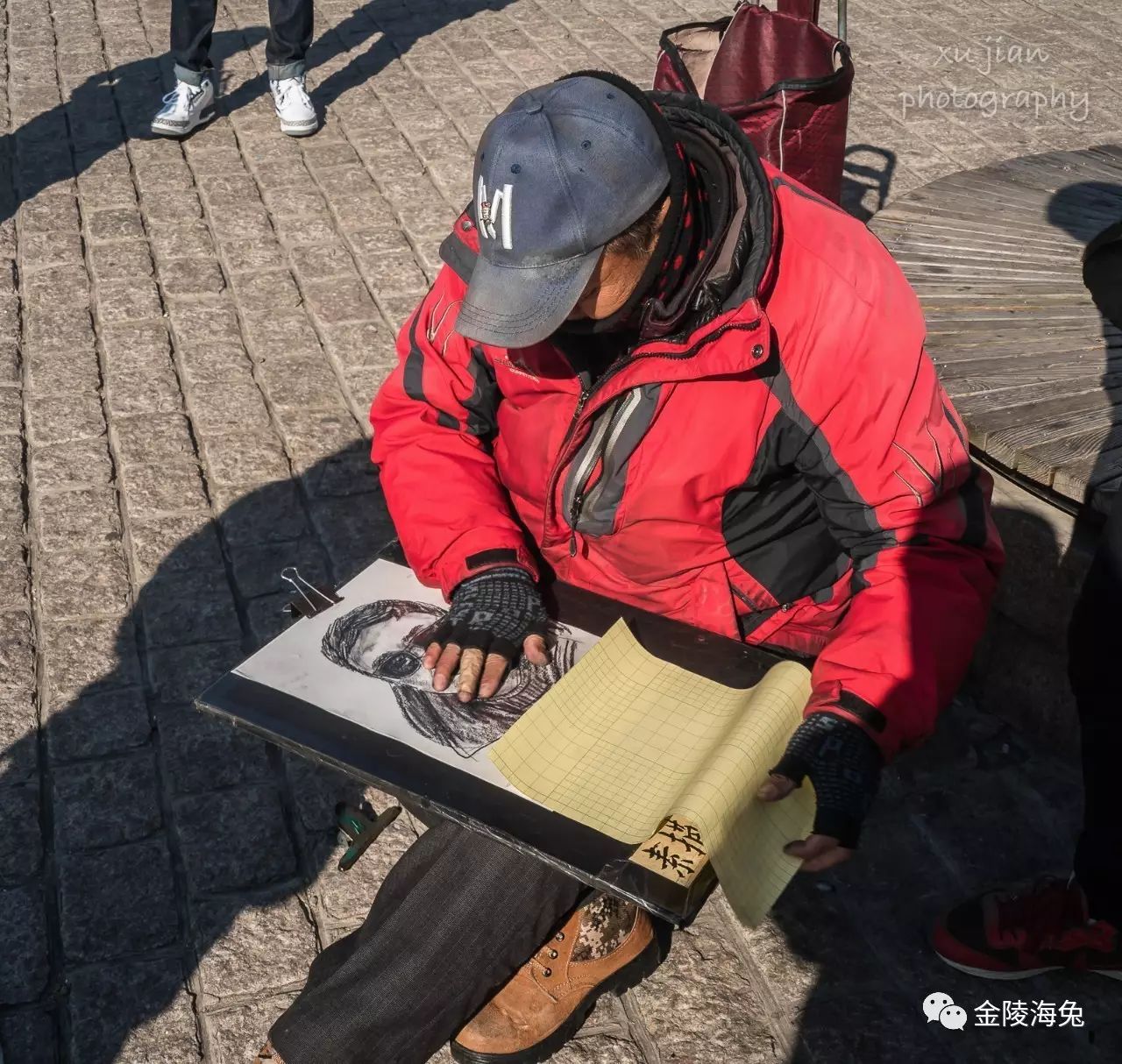 画师戴着半截毛线手套,围脖严实的捂着耳朵和鼻子----等我转过来拍的时候,画像的轮廓已经勾勒完毕。