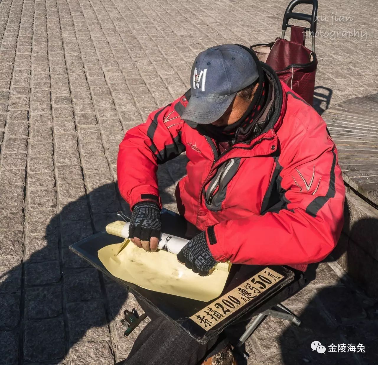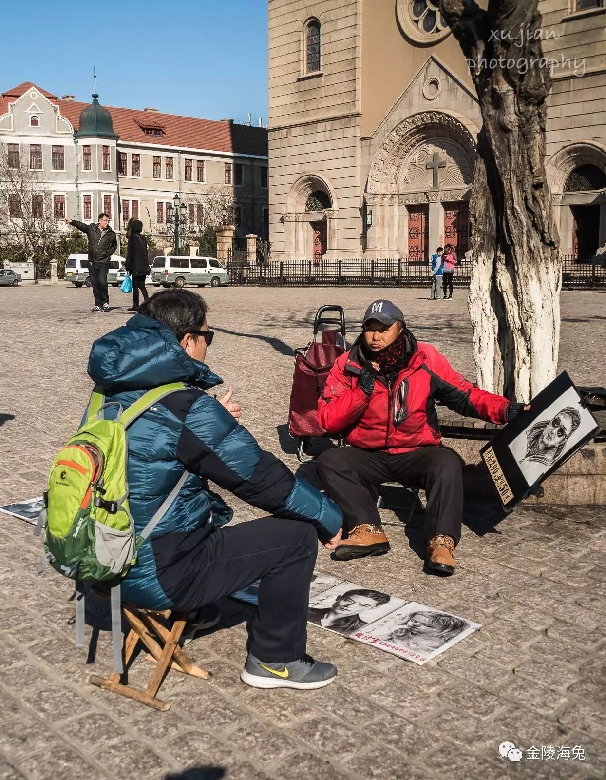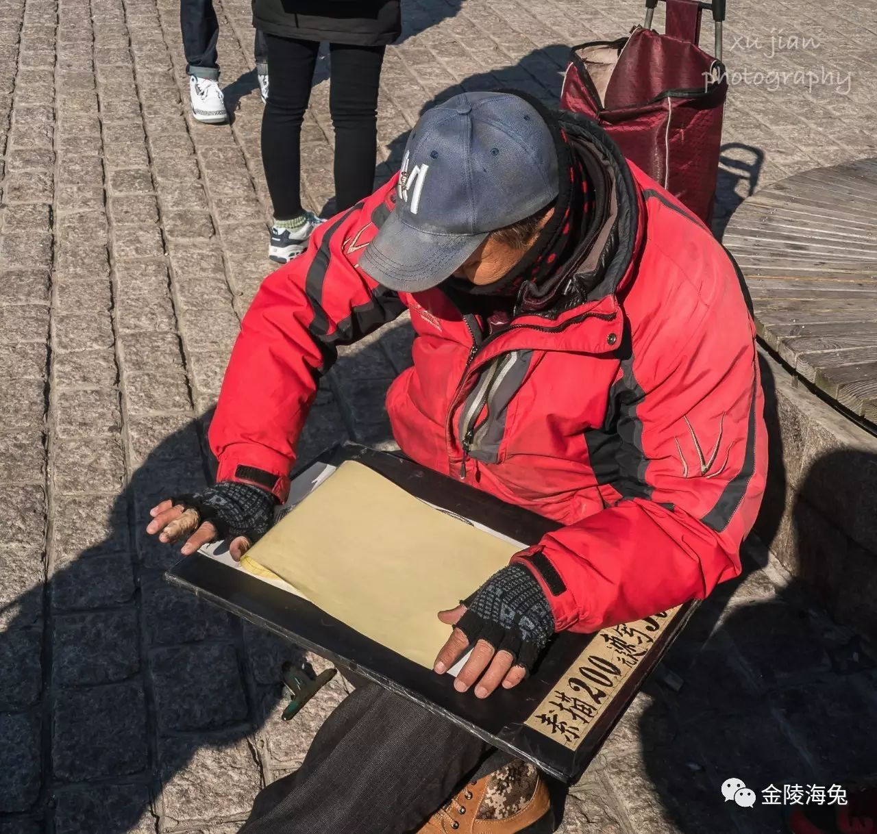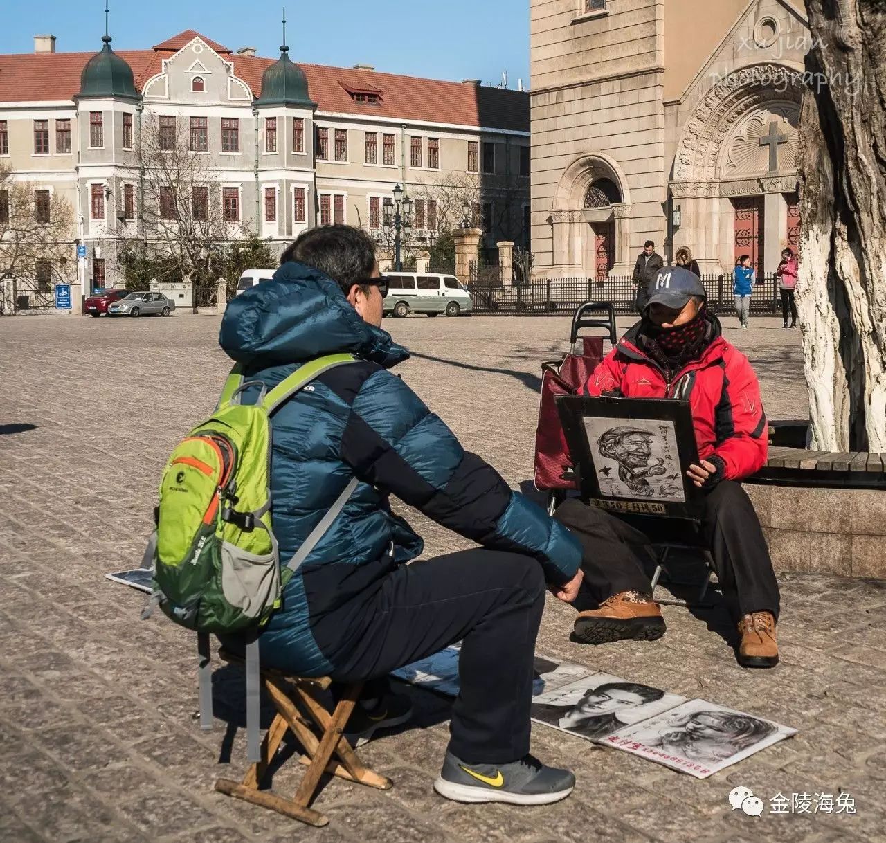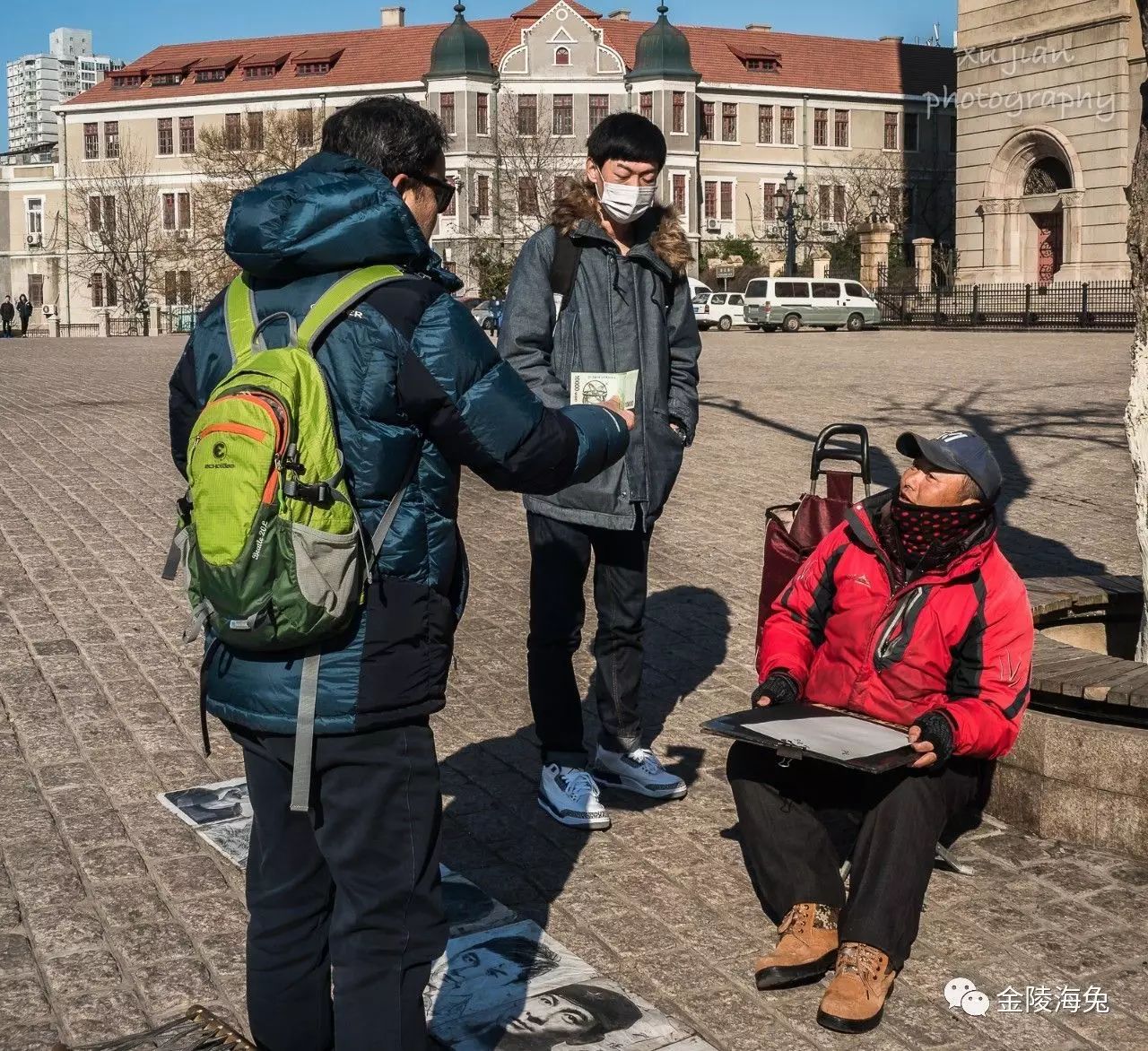 画师戴着半截毛线手套,围脖严实的捂着耳朵和鼻子----等我转过来拍的时候,画像的轮廓已经勾勒完毕。