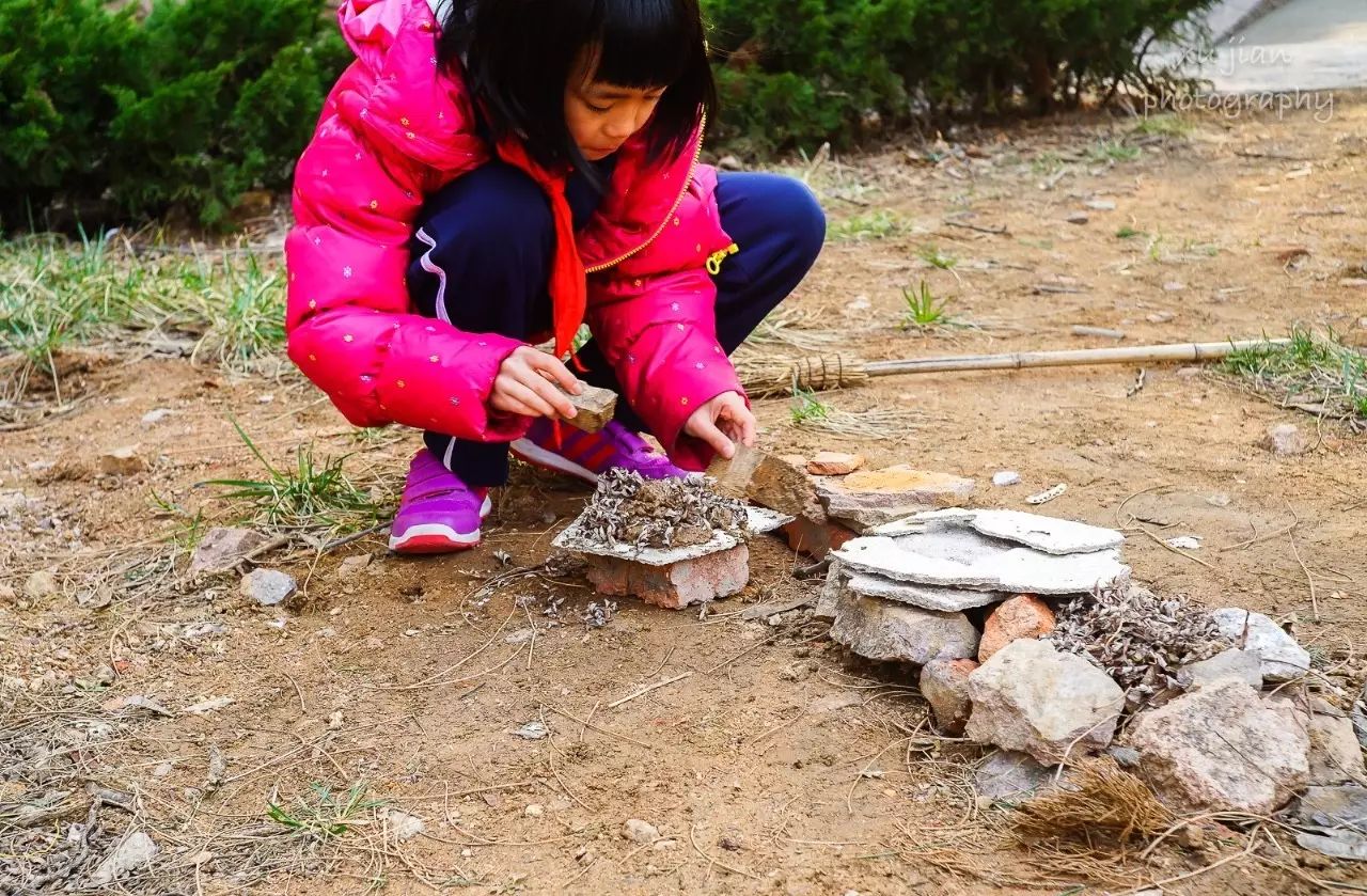女孩是“泥瓦匠”,在泥巴里掺上树叶,好比“混凝土”。