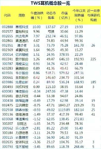 题材方面最近最火的是TWS耳机,春哥认为这也只是个题材炒作,在弱势行情下,持续性有待观察,整理了一份TWS耳机概念股名单,供激进类投资者参考: