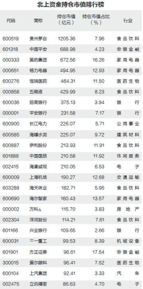 食品饮料持仓市值超2400亿,其次的家用电器行业持仓市值超1400亿。医药生物、银行及非银金融行业持仓市值都超千亿。不难发现,以上5行业均属于大金融、大消费行业。事实上,北上资金配置的金融消费类股持仓市值占比接近六成。