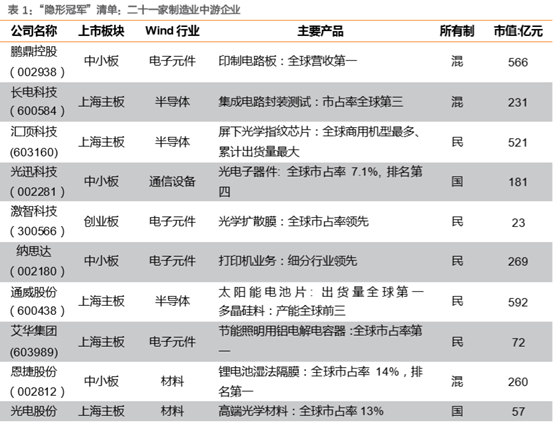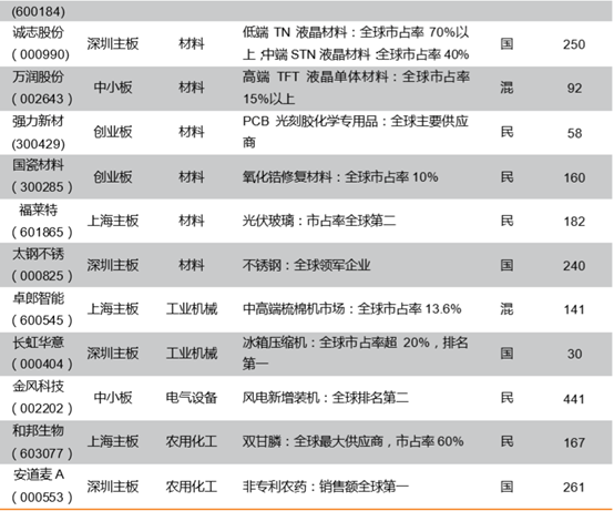 通过这个方法,天风证券筛选出了二十一家制造业企业。从产品看,主要集中在电子、材料、机械、化工等领域。市值集中在100-300亿,民企和混合所有制占七成,国企占三成。这些企业不仅全球市场份额处于领先行列,而且在各自的行业领域也形成了一定的技术门槛。