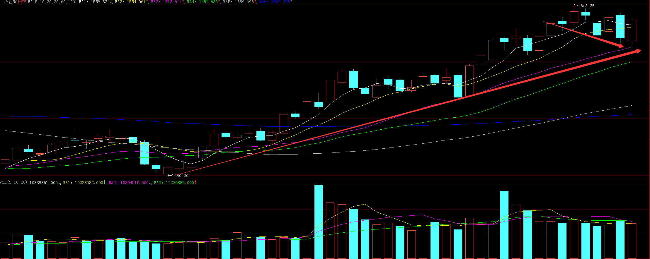 科创50指数今天再收阳线,实体过昨天阴线的半分位,站上五天和十天均线,其生命线是20天均线1513点,具体如图所示: