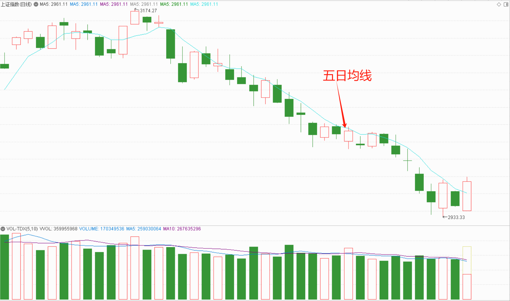 不过,好的现象是,本轮调整自5月23日下破5天均线以来,共运行了24个交易日,其中有8根阳线,16根阴线,前7次阳线反弹均止步于五天均线,没有一次成功有效站稳过,而今天到中午收盘,还收在五天均线位2959点上方,如果今天下午收盘还收在这个点位之上,那就是自本轮调整以来,第一次收盘距离五天均线稍远的位置上,此前距离有效突破最近的一次反弹是5月18日,当天阳线收盘在3030点,五天均线位是在3029点,次日股指收阴重新回到五天均线下方,宣告突破失败。