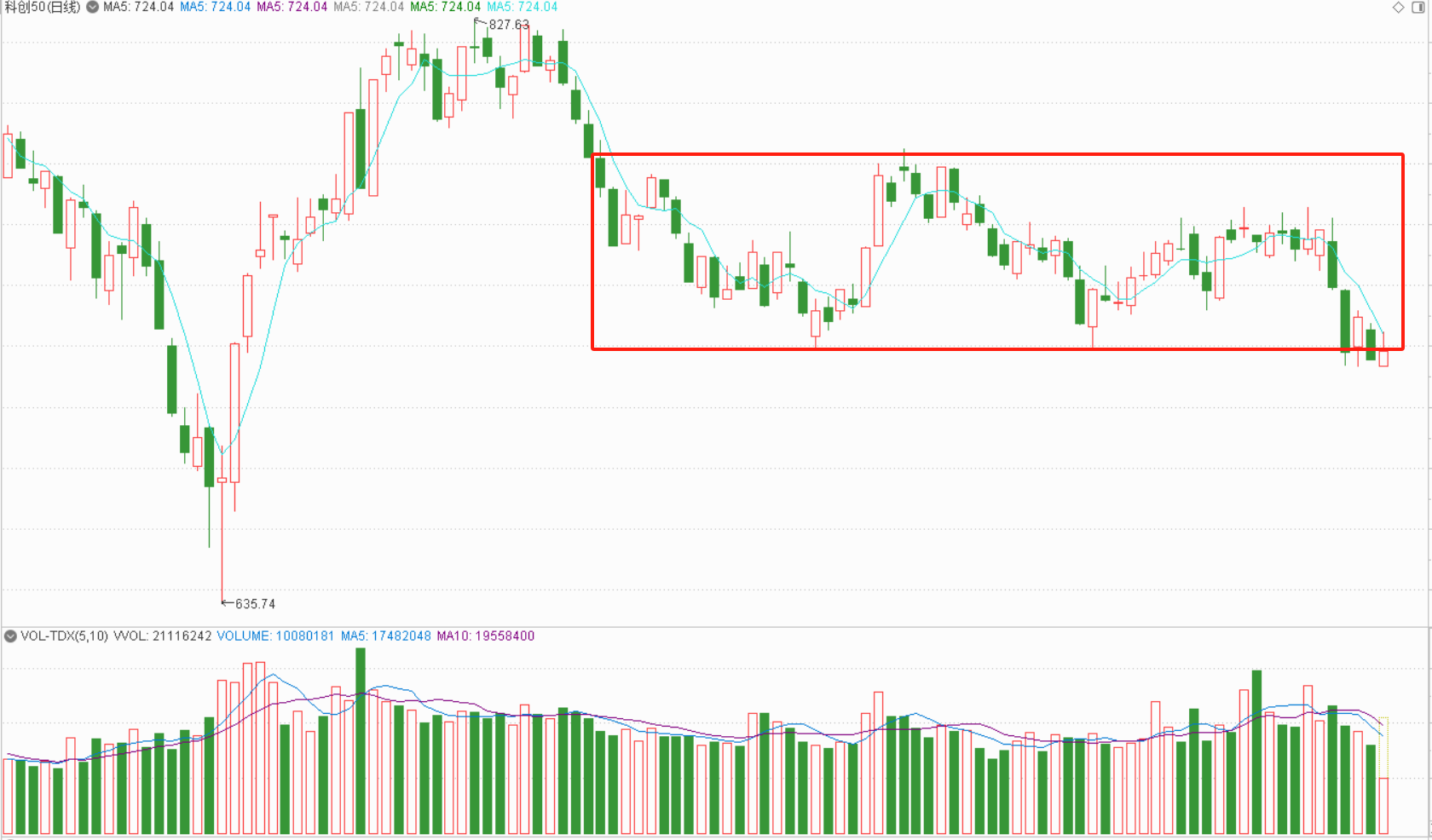 因为如果看一眼科创50指数,今天反弹止步于五天均线位,同时下破了前期低点719点,如果短期内不能快速收上五天均线上方,那么就是很可能有效跌破前箱体下边线,形成一次技术性破位,根据箱体理论跌幅目标测算,其对应的位置应该是653点,距离前低635点不远,这就意味着科创50指数短期面临着逆水行舟不进则退的状态。