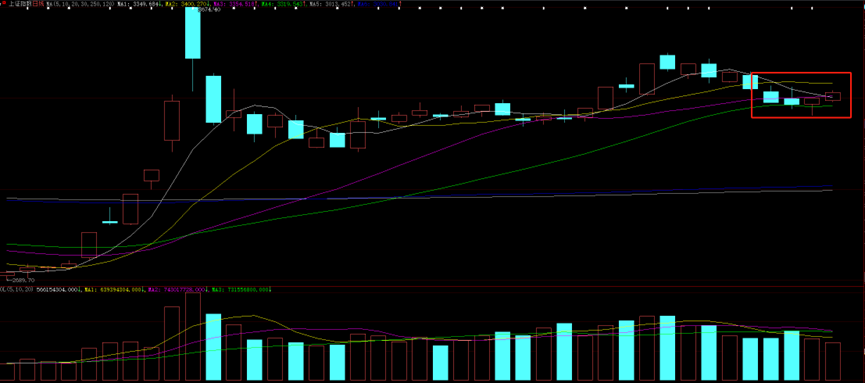 目前沪指主要运行在10天均和30天均线之间3400-3319点区域,这两条均线开始走平,中间还夹着5天和20天均线,所以这四条均线全部粘合于3350点一线区域,上下差不多就是100点。
