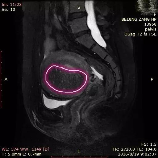 我们对这个病人就采用这样的技术,这种技术是在核磁共振的机器下做的,称之为“磁波”。治疗中核磁共振的目的是为了了解治疗过程中病灶所在的位置,并可以对治疗靶区的温度进行实时监测,通过调节单次辐照的剂量,使得病灶部位的温度达到65度以上,同时对治疗区以外的温度也进行监控,避免副损伤的出现。