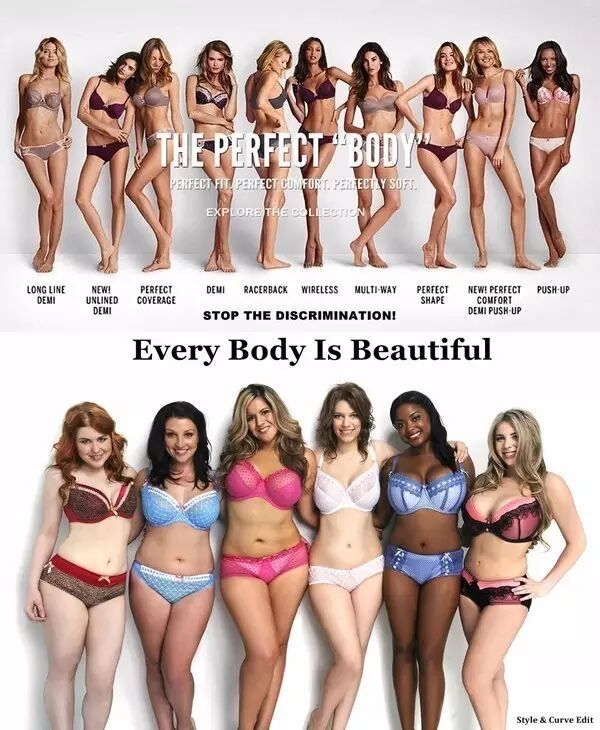 想到维秘也曾经出过一张海报,身材火辣的维密天使一字排开,标题是“The Perfect Body”(完美的身体)。海报面世后,有人也用海报回击:Every body is perfect。